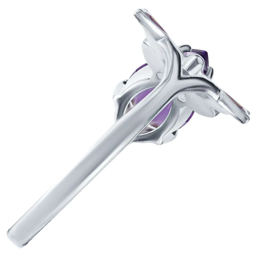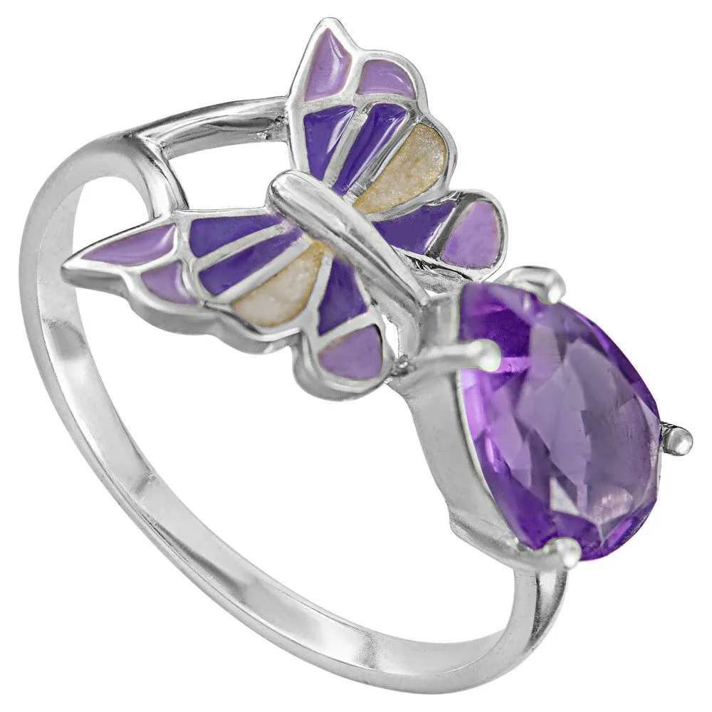 Серебряное кольцо с натуральным аметистом и эмалью - коллекция Бабочка, покрытие Белый Родий. Средний вес украшения с камнями 2.41 гр. Месторождение: Аметист (Приполярный Урал, Россия). Аметист (Натуральный) груша 6*9 мм., средний вес: 1.24 карат. Все изделия собственного производства и имеют гарантию 12 месяцев, к каждому изделию прилагается паспорт. Арт. 8448WR. Аметист — прозрачный или полупрозрачный камень фиолетовых оттенков, подвид кварца. Он гармонизирует разум, снимает стресс, улучшает кровообращение, способствует умственному развитию и личностному росту. Считается, что он также оберегает от головной боли и бессонницы, служит противоядием, помогает избавиться от алкоголизма и наделяет владельца проницательностью, раскрывая «третий глаз» (за который отвечает чакра аджна). В медитации помогает расслабиться и успокоиться. Положенный под подушку, аметист приносит хорошие сны.
