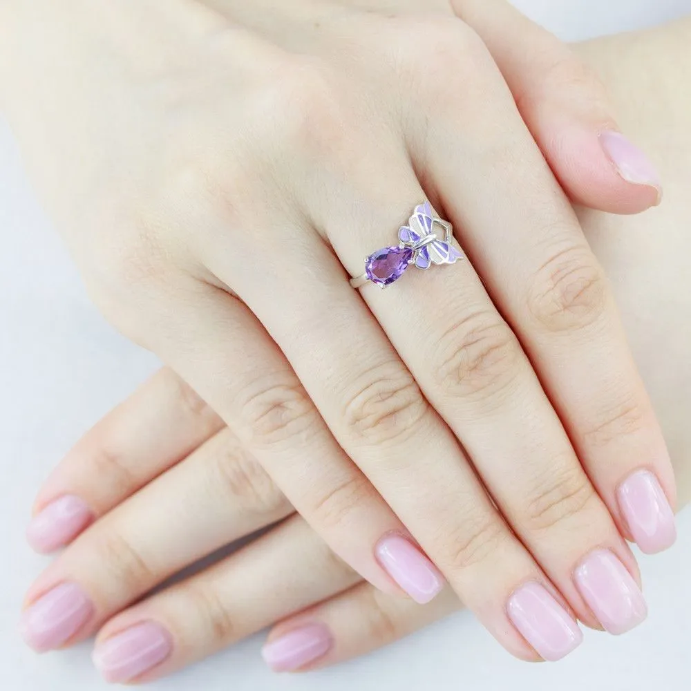 Серебряное кольцо с натуральным аметистом и эмалью - коллекция Бабочка, покрытие Чистое Серебро. Средний вес украшения с камнями 2.5 гр. Месторождение: Аметист (Приполярный Урал, Россия). Аметист (Натуральный) груша 6*9 мм., средний вес: 1.24 карат. Все изделия собственного производства и имеют гарантию 12 месяцев, к каждому изделию прилагается паспорт. Арт. 8449AG. Аметист — прозрачный или полупрозрачный камень фиолетовых оттенков, подвид кварца. Он гармонизирует разум, снимает стресс, улучшает кровообращение, способствует умственному развитию и личностному росту. Считается, что он также оберегает от головной боли и бессонницы, служит противоядием, помогает избавиться от алкоголизма и наделяет владельца проницательностью, раскрывая «третий глаз» (за который отвечает чакра аджна). В медитации помогает расслабиться и успокоиться. Положенный под подушку, аметист приносит хорошие сны.