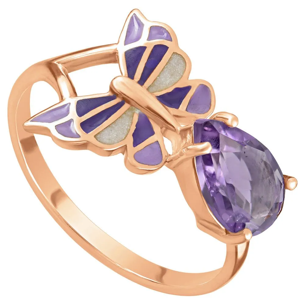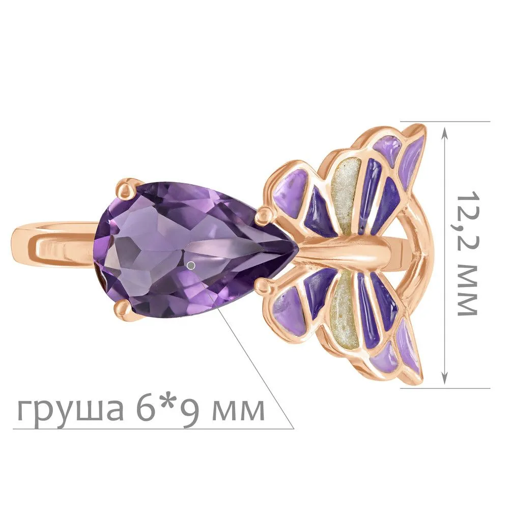Серебряное кольцо с натуральным аметистом и эмалью - коллекция Бабочка, покрытие Красное Золото. Средний вес украшения с камнями 2.5 гр. Месторождение: Аметист (Приполярный Урал, Россия). Аметист (Натуральный) груша 6*9 мм., средний вес: 1.24 карат. Все изделия собственного производства и имеют гарантию 12 месяцев, к каждому изделию прилагается паспорт. Арт. 8449RG. Аметист — прозрачный или полупрозрачный камень фиолетовых оттенков, подвид кварца. Он гармонизирует разум, снимает стресс, улучшает кровообращение, способствует умственному развитию и личностному росту. Считается, что он также оберегает от головной боли и бессонницы, служит противоядием, помогает избавиться от алкоголизма и наделяет владельца проницательностью, раскрывая «третий глаз» (за который отвечает чакра аджна). В медитации помогает расслабиться и успокоиться. Положенный под подушку, аметист приносит хорошие сны.