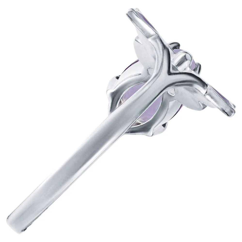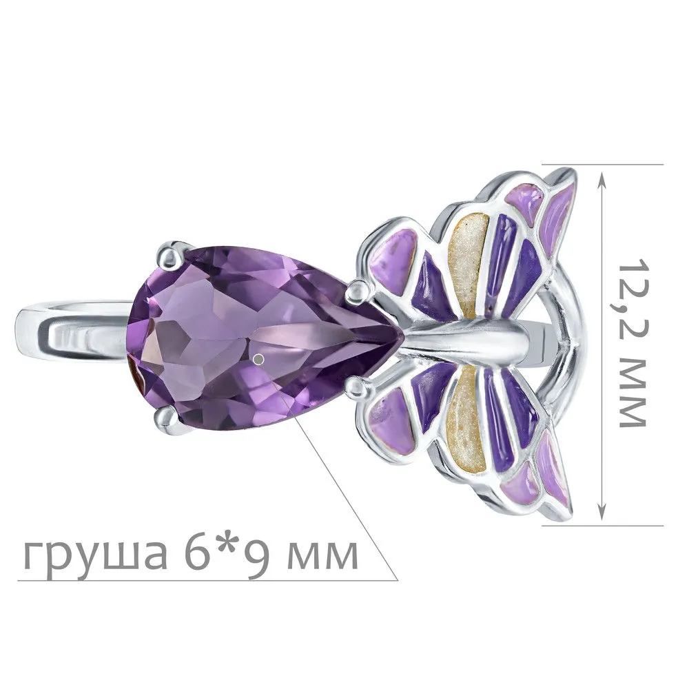 Серебряное кольцо с натуральным аметистом и эмалью - коллекция Бабочка, покрытие Белый Родий. Средний вес украшения с камнями 2.5 гр. Месторождение: Аметист (Приполярный Урал, Россия). Аметист (Натуральный) груша 6*9 мм., средний вес: 1.24 карат. Все изделия собственного производства и имеют гарантию 12 месяцев, к каждому изделию прилагается паспорт. Арт. 8449WR. Аметист — прозрачный или полупрозрачный камень фиолетовых оттенков, подвид кварца. Он гармонизирует разум, снимает стресс, улучшает кровообращение, способствует умственному развитию и личностному росту. Считается, что он также оберегает от головной боли и бессонницы, служит противоядием, помогает избавиться от алкоголизма и наделяет владельца проницательностью, раскрывая «третий глаз» (за который отвечает чакра аджна). В медитации помогает расслабиться и успокоиться. Положенный под подушку, аметист приносит хорошие сны.