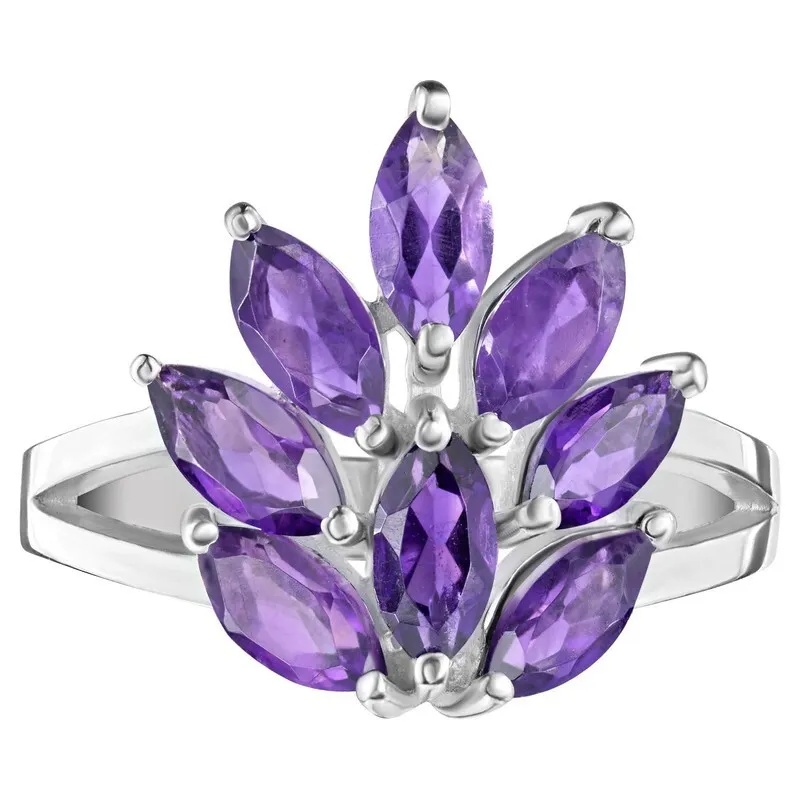 Серебряное кольцо с натуральным аметистом (темным) - коллекция Искра. Средний вес украшения с камнями 2.41 гр. Месторождение: Аметист (Приполярный Урал, Россия). Аметист (Натуральный) маркиз 3*6 мм., средний вес: 0.23 карат. Все изделия собственного производства и имеют гарантию 12 месяцев. Арт. 8467. Аметист — прозрачный или полупрозрачный камень фиолетовых оттенков, подвид кварца. Он гармонизирует разум, снимает стресс, улучшает кровообращение, способствует умственному развитию и личностному росту. Считается, что он также оберегает от головной боли и бессонницы, служит противоядием, помогает избавиться от алкоголизма и наделяет владельца проницательностью, раскрывая «третий глаз» (за который отвечает чакра аджна). В медитации помогает расслабиться и успокоиться. Положенный под подушку, аметист приносит хорошие сны.