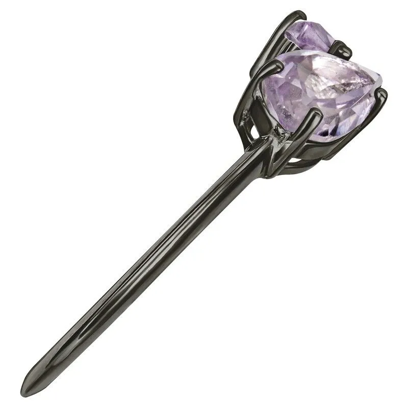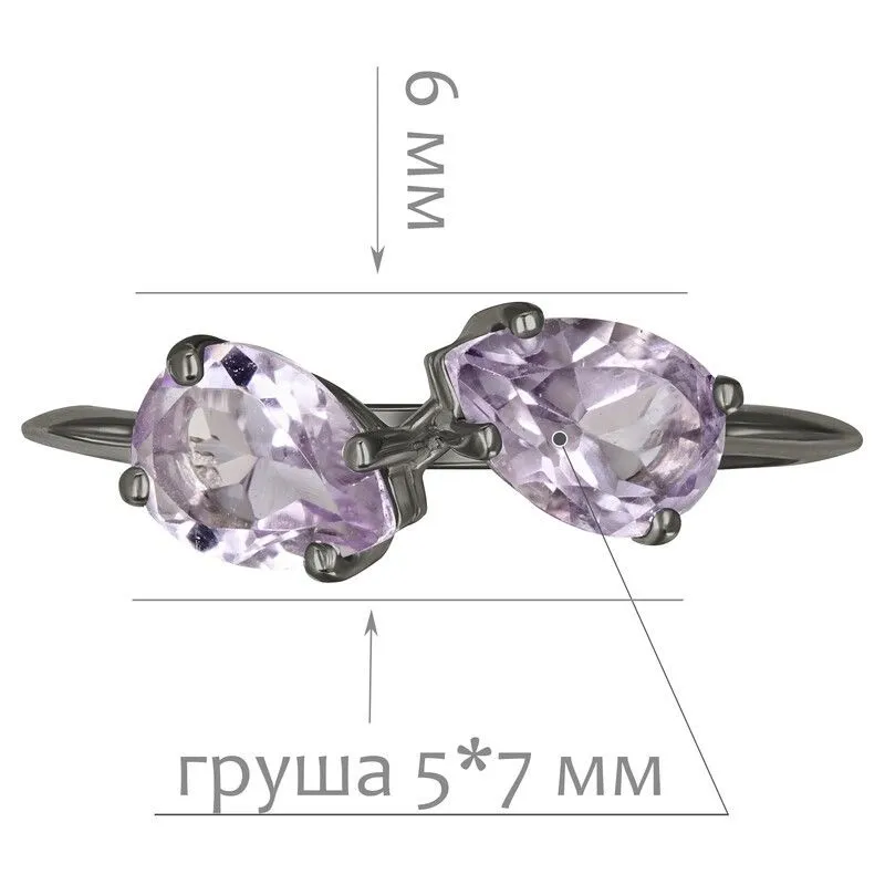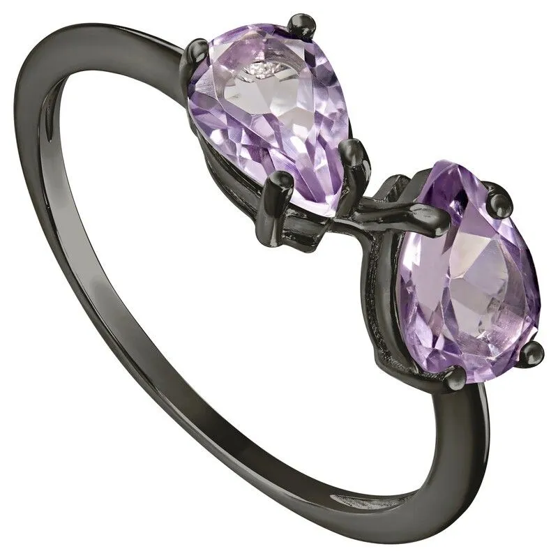 Серебряное кольцо с натуральным аметистом (светлый) - коллекция Дуэт / покрытие Черный Родий.Средний вес украшения с камнями 1.54 гр.Месторождение(я): Аметист (Приполярный Урал, Россия).Ювелирные вставки:Аметист (Натуральный) груша 5*7 мм., средний вес: 0.65 карат.Все изделия собственного производства и имеют гарантию 12 месяцев. Арт. 8623BR. Аметист — прозрачный или полупрозрачный камень фиолетовых оттенков, подвид кварца. Он гармонизирует разум, снимает стресс, улучшает кровообращение, способствует умственному развитию и личностному росту. Считается, что он также оберегает от головной боли и бессонницы, служит противоядием, помогает избавиться от алкоголизма и наделяет владельца проницательностью, раскрывая «третий глаз» (за который отвечает чакра аджна). В медитации помогает расслабиться и успокоиться. Положенный под подушку, аметист приносит хорошие сны.