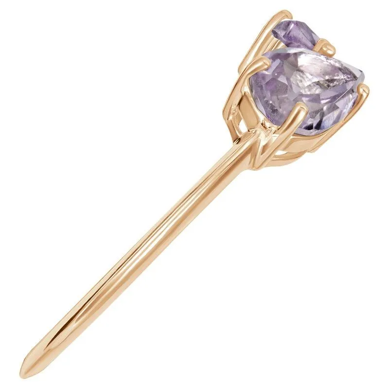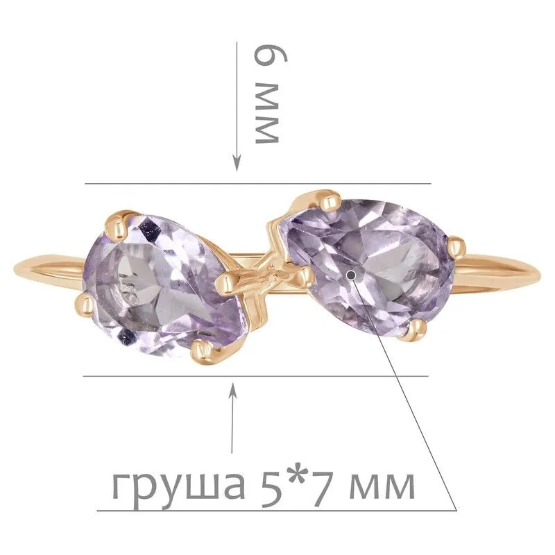Серебряное кольцо с натуральным аметистом (светлый) - коллекция Дуэт / покрытие Розовое Золото.Средний вес украшения с камнями 1.36 гр.Месторождение(я): Аметист (Приполярный Урал, Россия).Ювелирные вставки:Аметист (Натуральный) груша 5*7 мм., средний вес: 0.65 карат.Все изделия собственного производства и имеют гарантию 12 месяцев. Арт. 8623PG. Аметист — прозрачный или полупрозрачный камень фиолетовых оттенков, подвид кварца. Он гармонизирует разум, снимает стресс, улучшает кровообращение, способствует умственному развитию и личностному росту. Считается, что он также оберегает от головной боли и бессонницы, служит противоядием, помогает избавиться от алкоголизма и наделяет владельца проницательностью, раскрывая «третий глаз» (за который отвечает чакра аджна). В медитации помогает расслабиться и успокоиться. Положенный под подушку, аметист приносит хорошие сны.