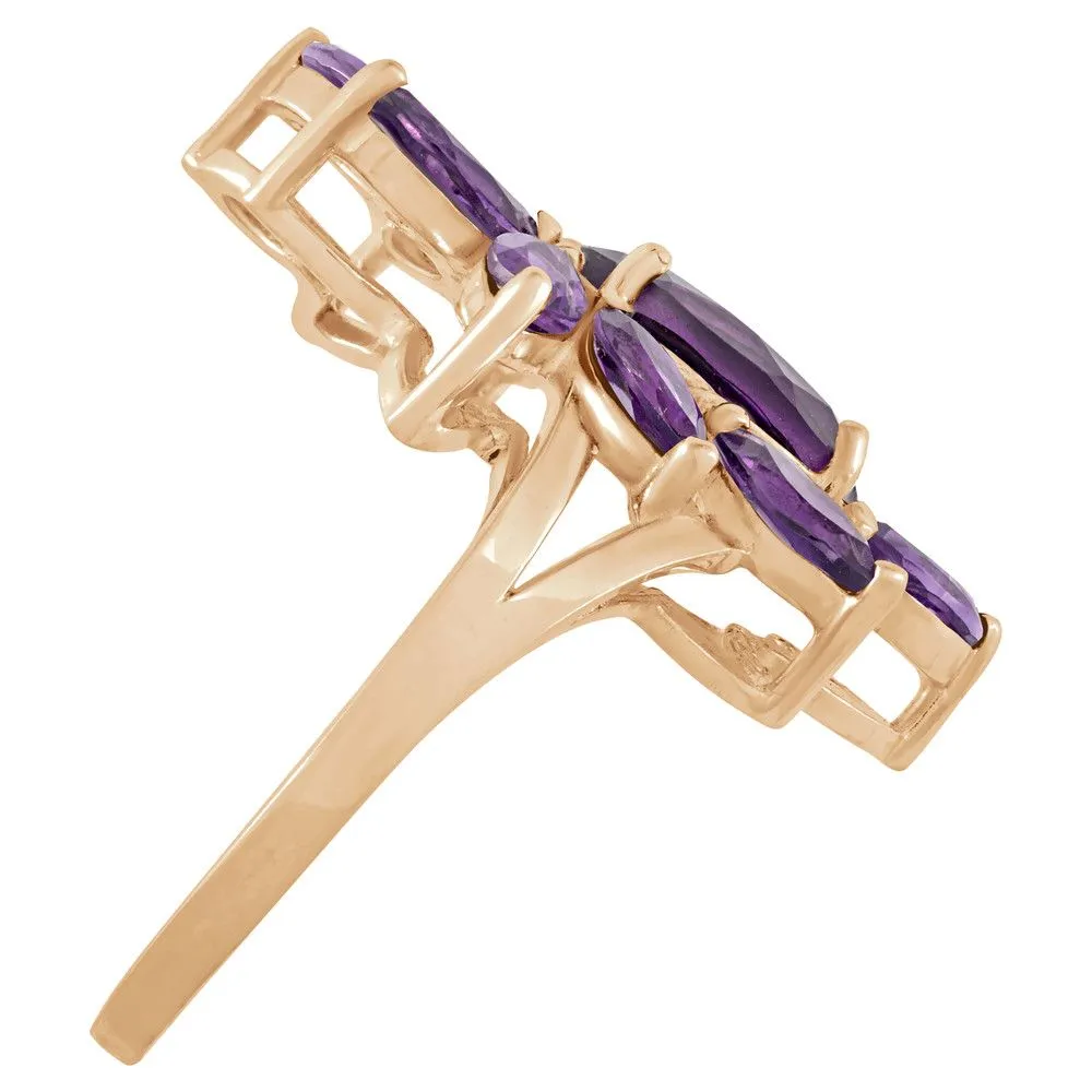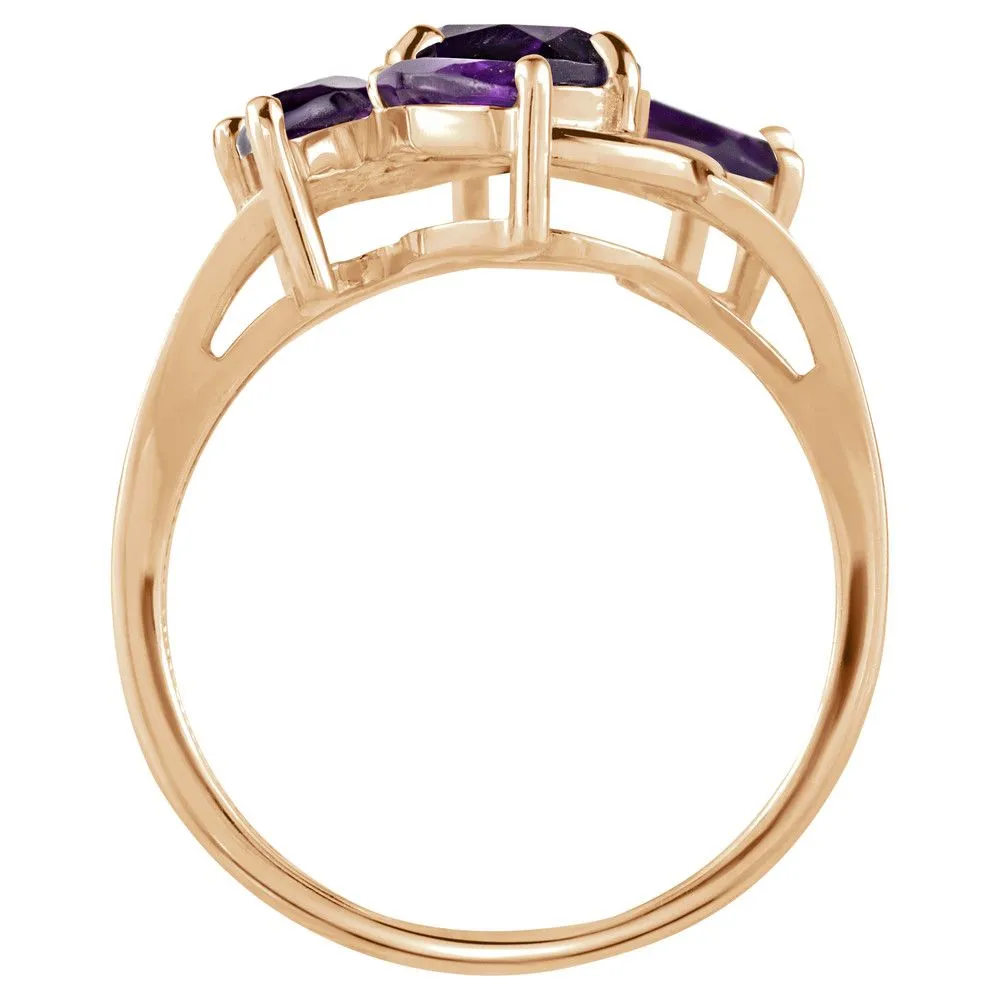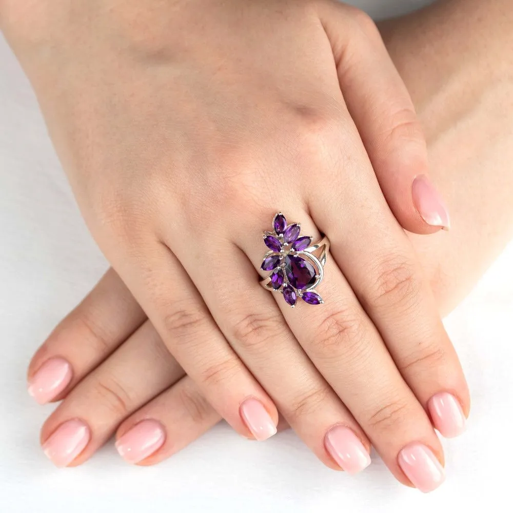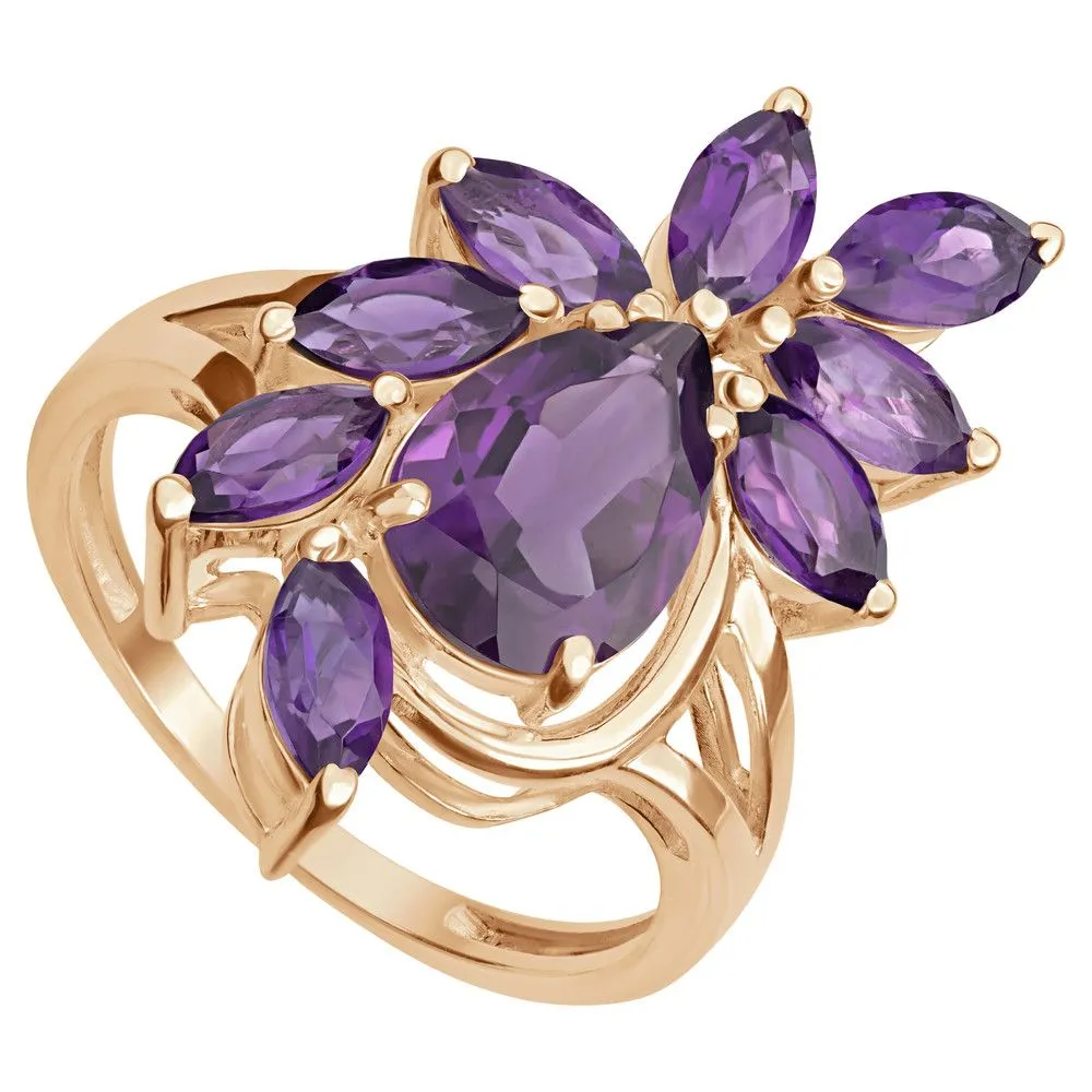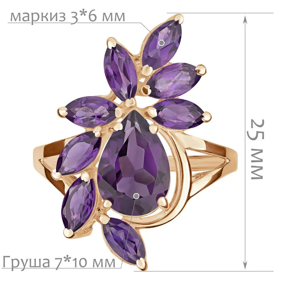 Серебряное кольцо с натуральным аметистом (темным) - коллекция Элегия / покрытие Розовое Золото. Средний вес украшения с камнями 3.98 гр. Месторождение: Аметист (Приполярный Урал, Россия) Ювелирные вставки: Аметист (Натуральный) груша 7*10 мм., средний вес: 1.7 карат. Аметист (Натуральный) маркиз 3*6 мм., средний вес: 0.26 карат. Все изделия собственного производства и имеют гарантию 12 месяцев. Арт. 8779PG. Аметист — прозрачный или полупрозрачный камень фиолетовых оттенков, подвид кварца. Он гармонизирует разум, снимает стресс, улучшает кровообращение, способствует умственному развитию и личностному росту. Считается, что он также оберегает от головной боли и бессонницы, служит противоядием, помогает избавиться от алкоголизма и наделяет владельца проницательностью, раскрывая «третий глаз» (за который отвечает чакра аджна). В медитации помогает расслабиться и успокоиться. Положенный под подушку, аметист приносит хорошие сны.
