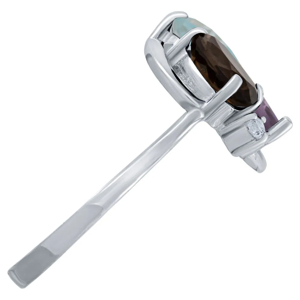 Серебряное кольцо "Фортуна" с натуральными камнями раухтопаз, голубой топаз и аметист, без покрытия. Средний вес украшения с камнями 3,16 гр. Месторождение(я) камней: Раухтопаз (Дымчатый кварц) (м-ние Додо ХМАО, Россия), Топаз (Ильменские горы, Россия), Аметист (Приполярный Урал, Россия). Аметист (Натуральный) маркиз: 4*8 мм., средний вес 0,50 карат. Раухтопаз (Натуральный) овал: 5*7 мм., средний вес 0,80 карат. Топаз (Натуральный) груша: 5*7 мм., средний вес 0,80 карат. Циркон белый (Натуральный) круг: 2 мм., средний вес 0,05 карат. Размер лицевой части: 13*15 мм. Все изделия собственного производства и имеют гарантию 12 месяцев. Арт. 6616NP