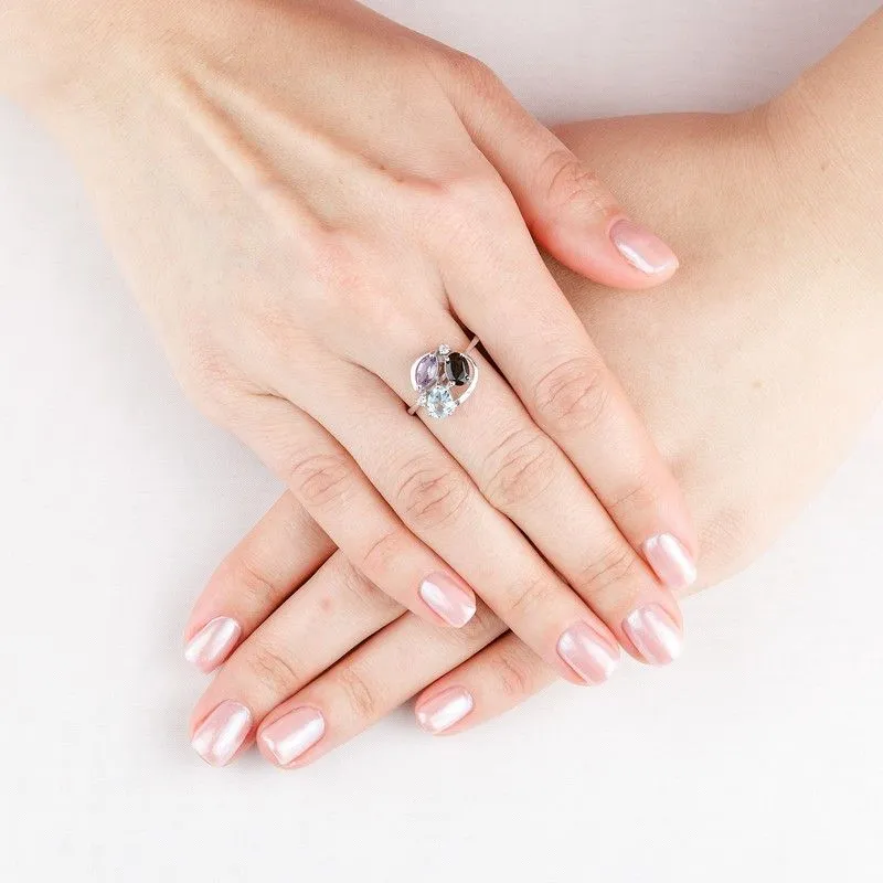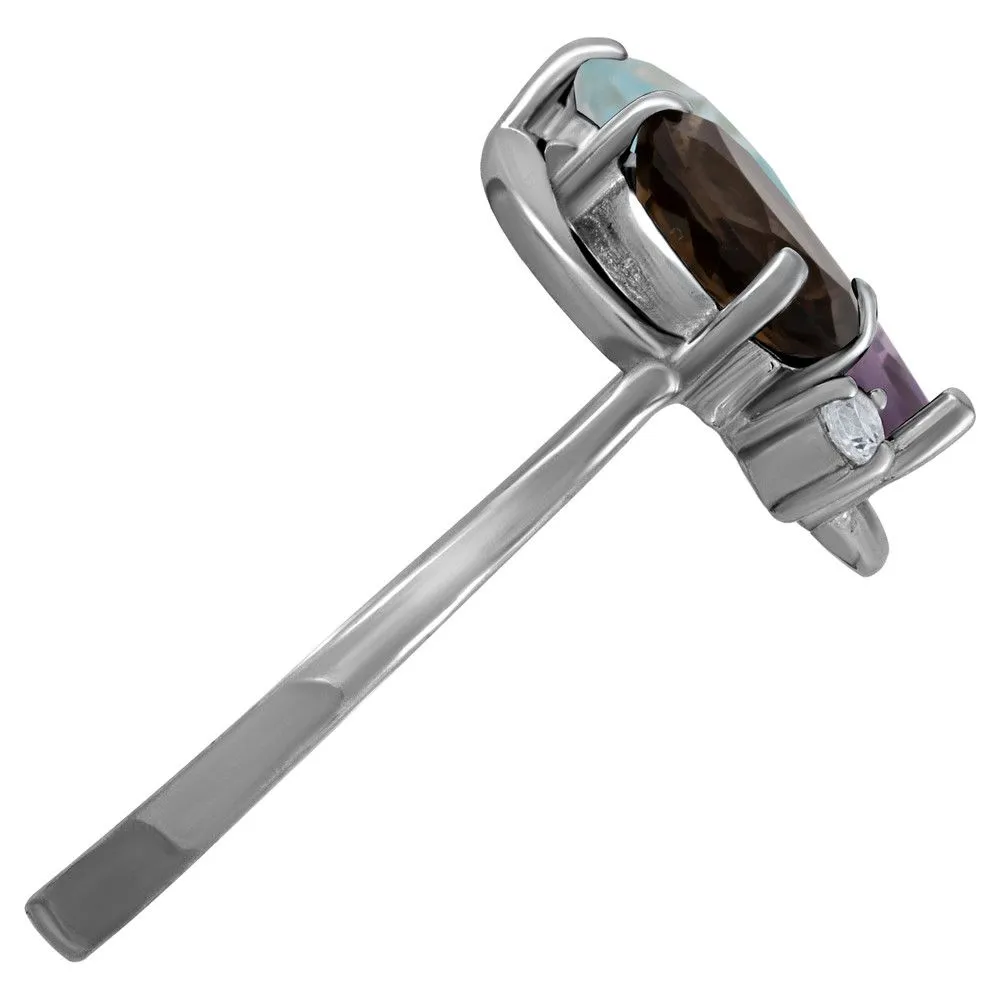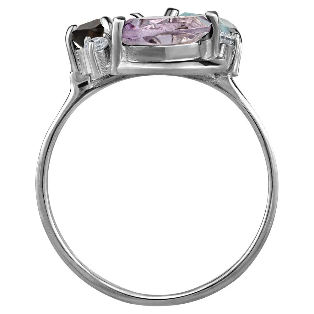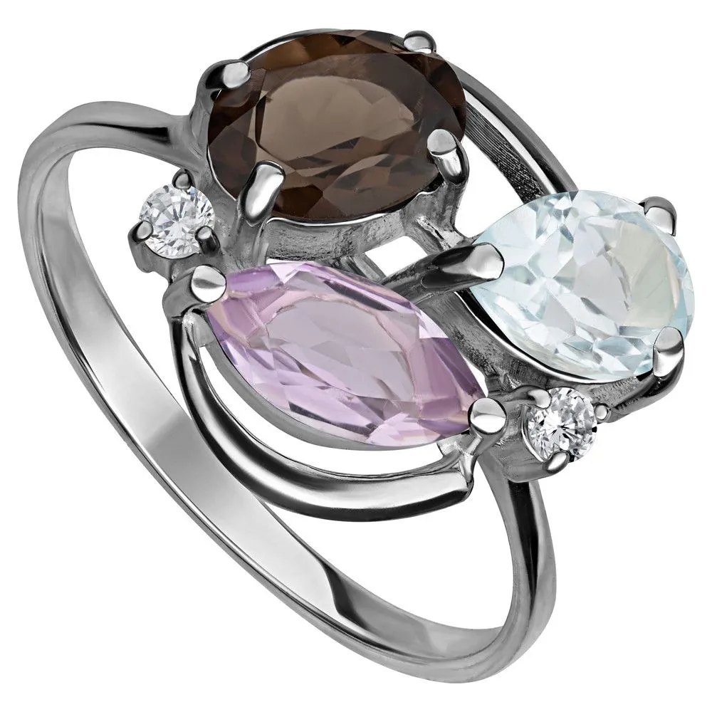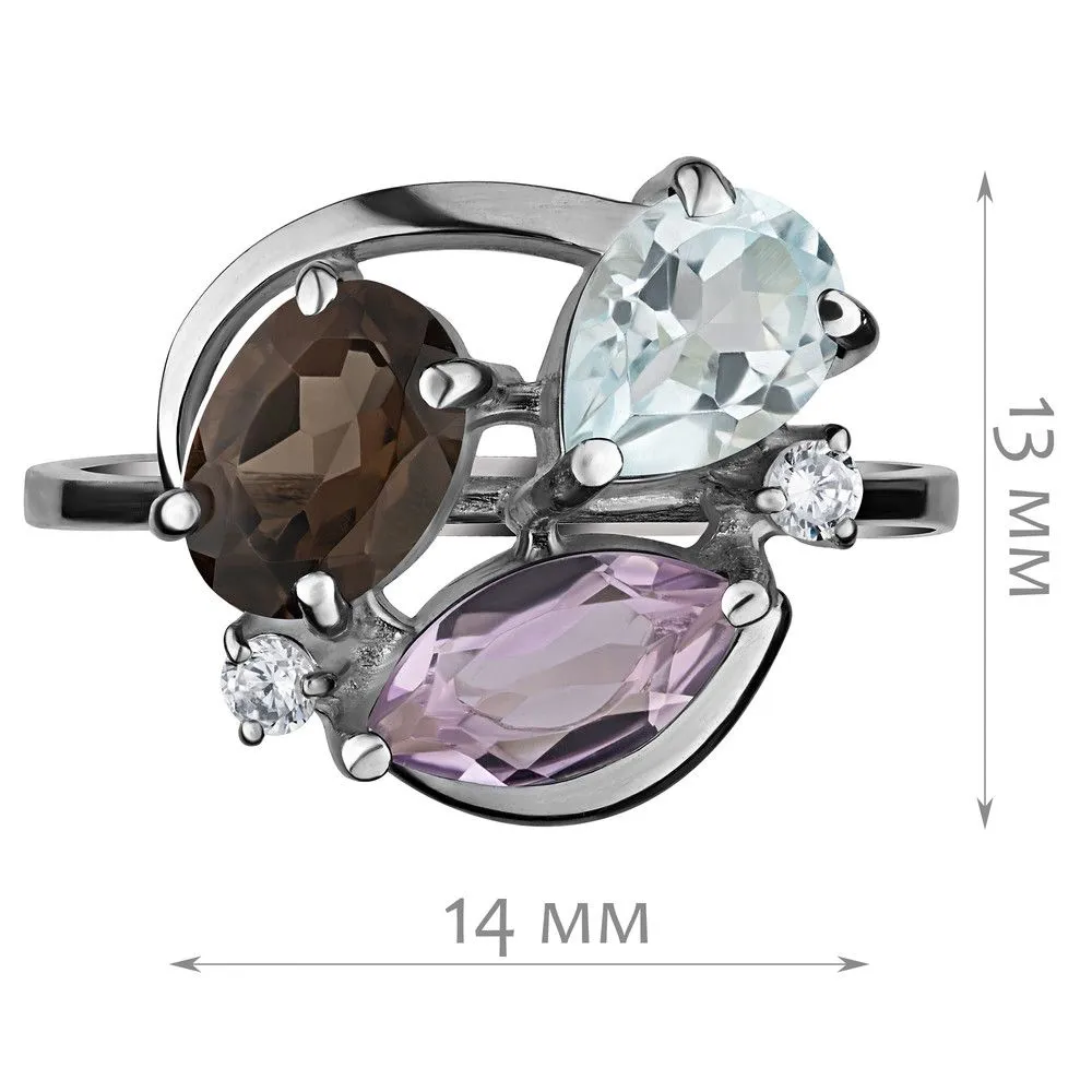 Серебряное кольцо "Фортуна" с натуральными камнями раухтопаз, голубой топаз и аметист, покрытие Палладий. Средний вес украшения с камнями 3,16 гр. Месторождение(я) камней: Раухтопаз (Дымчатый кварц) (м-ние Додо ХМАО, Россия), Топаз (Ильменские горы, Россия), Аметист (Приполярный Урал, Россия). Аметист (Натуральный) маркиз: 4*8 мм., средний вес 0,50 карат. Раухтопаз (Натуральный) овал: 5*7 мм., средний вес 0,80 карат. Топаз (Натуральный) груша: 5*7 мм., средний вес 0,80 карат. Циркон белый (Натуральный) круг: 2 мм., средний вес 0,05 карат. Размер лицевой части: 13*15 мм. Все изделия собственного производства и имеют гарантию 12 месяцев. Арт. 6616PD. Аметист — прозрачный или полупрозрачный камень фиолетовых оттенков, подвид кварца. Он гармонизирует разум, снимает стресс, улучшает кровообращение, способствует умственному развитию и личностному росту. Считается, что он также оберегает от головной боли и бессонницы, служит противоядием, помогает избавиться от алкоголизма и наделяет владельца проницательностью, раскрывая «третий глаз» (за который отвечает чакра аджна). В медитации помогает расслабиться и успокоиться. Положенный под подушку, аметист приносит хорошие сны.