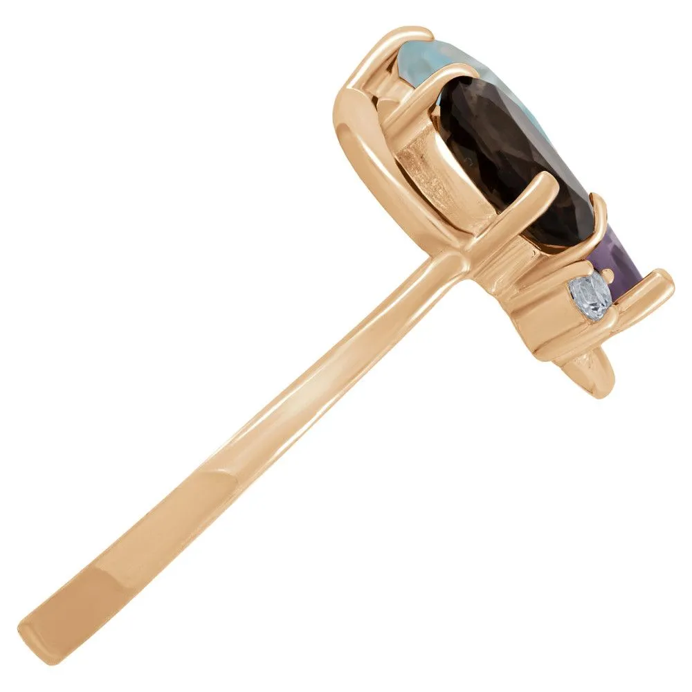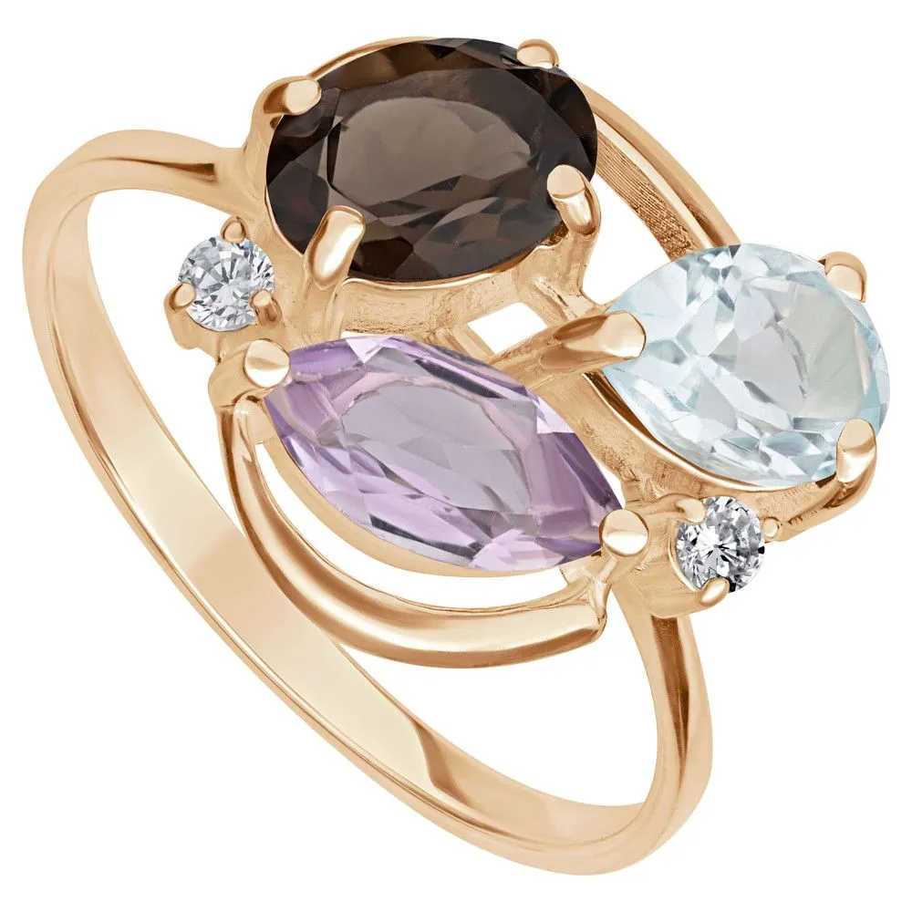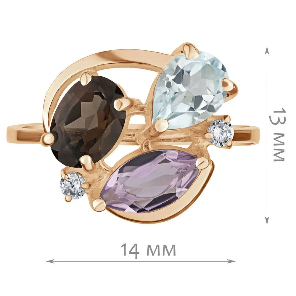 Серебряное кольцо "Фортуна" с натуральными камнями раухтопаз, голубой топаз и аметист, покрытие Розовое Золото. Средний вес украшения с камнями 3,16 гр. Месторождение(я) камней: Раухтопаз (Дымчатый кварц) (м-ние Додо ХМАО, Россия), Топаз (Ильменские горы, Россия), Аметист (Приполярный Урал, Россия). Аметист (Натуральный) маркиз: 4*8 мм., средний вес 0,50 карат. Раухтопаз (Натуральный) овал: 5*7 мм., средний вес 0,80 карат. Топаз (Натуральный) груша: 5*7 мм., средний вес 0,80 карат. Циркон белый (Натуральный) круг: 2 мм., средний вес 0,05 карат. Размер лицевой части: 13*15 мм. Все изделия собственного производства и имеют гарантию 12 месяцев. Арт. 6616PG. Аметист — прозрачный или полупрозрачный камень фиолетовых оттенков, подвид кварца. Он гармонизирует разум, снимает стресс, улучшает кровообращение, способствует умственному развитию и личностному росту. Считается, что он также оберегает от головной боли и бессонницы, служит противоядием, помогает избавиться от алкоголизма и наделяет владельца проницательностью, раскрывая «третий глаз» (за который отвечает чакра аджна). В медитации помогает расслабиться и успокоиться. Положенный под подушку, аметист приносит хорошие сны.