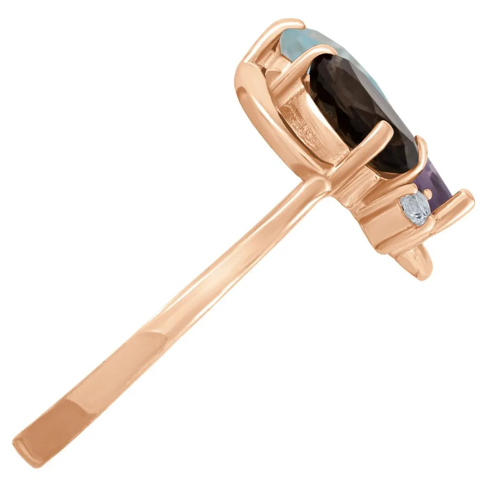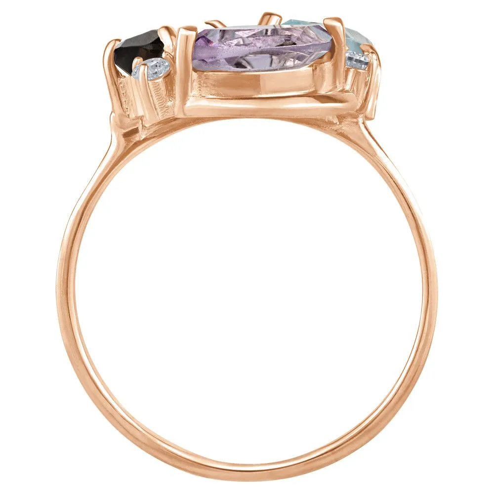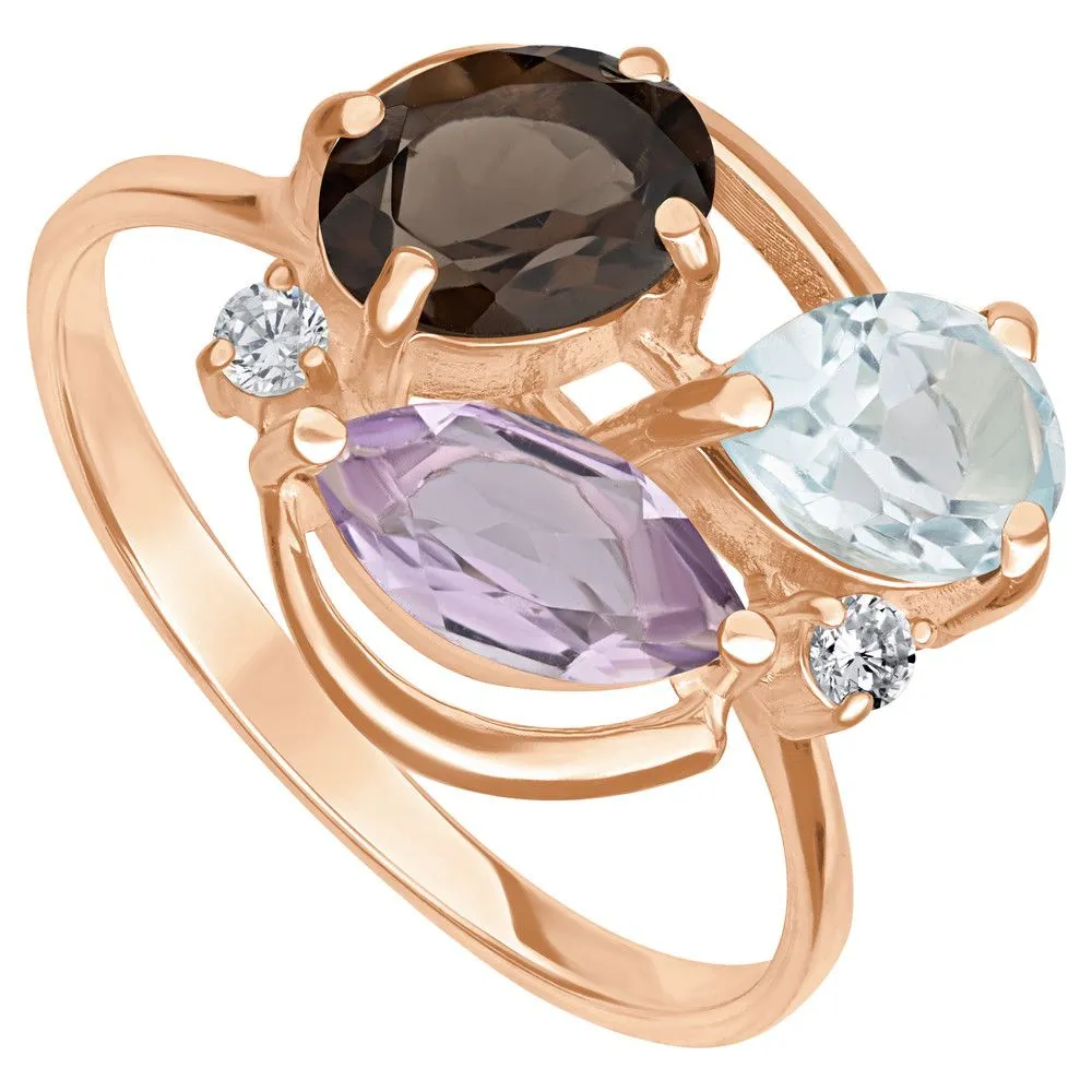 Серебряное кольцо "Фортуна" с натуральными камнями раухтопаз, голубой топаз и аметист, покрытие Красное Золото. Средний вес украшения с камнями 3,16 гр. Месторождение(я) камней: Раухтопаз (Дымчатый кварц) (м-ние Додо ХМАО, Россия), Топаз (Ильменские горы, Россия), Аметист (Приполярный Урал, Россия). Аметист (Натуральный) маркиз: 4*8 мм., средний вес 0,50 карат. Раухтопаз (Натуральный) овал: 5*7 мм., средний вес 0,80 карат. Топаз (Натуральный) груша: 5*7 мм., средний вес 0,80 карат. Циркон белый (Натуральный) круг: 2 мм., средний вес 0,05 карат. Размер лицевой части: 13*15 мм. Все изделия собственного производства и имеют гарантию 12 месяцев. Арт. 6616RG. Аметист — прозрачный или полупрозрачный камень фиолетовых оттенков, подвид кварца. Он гармонизирует разум, снимает стресс, улучшает кровообращение, способствует умственному развитию и личностному росту. Считается, что он также оберегает от головной боли и бессонницы, служит противоядием, помогает избавиться от алкоголизма и наделяет владельца проницательностью, раскрывая «третий глаз» (за который отвечает чакра аджна). В медитации помогает расслабиться и успокоиться. Положенный под подушку, аметист приносит хорошие сны.