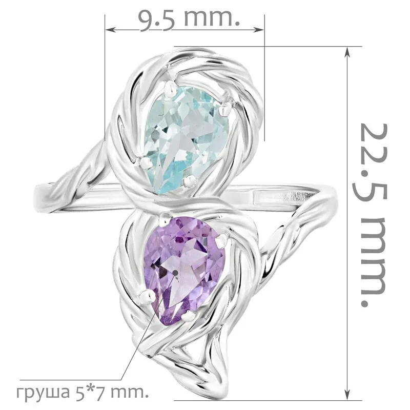 Серебряное кольцо с натуральным аметистом и топазом - коллекция Ривьера. Средний вес изделия с камнями 2.83 гр. Месторождение(я): Аметист (Приполярный Урал, Россия) и Топаз (Ильменские горы, Россия). Аметист (Натуральный) груша 5*7 мм., средний вес: 0.68 карат.