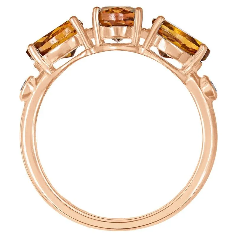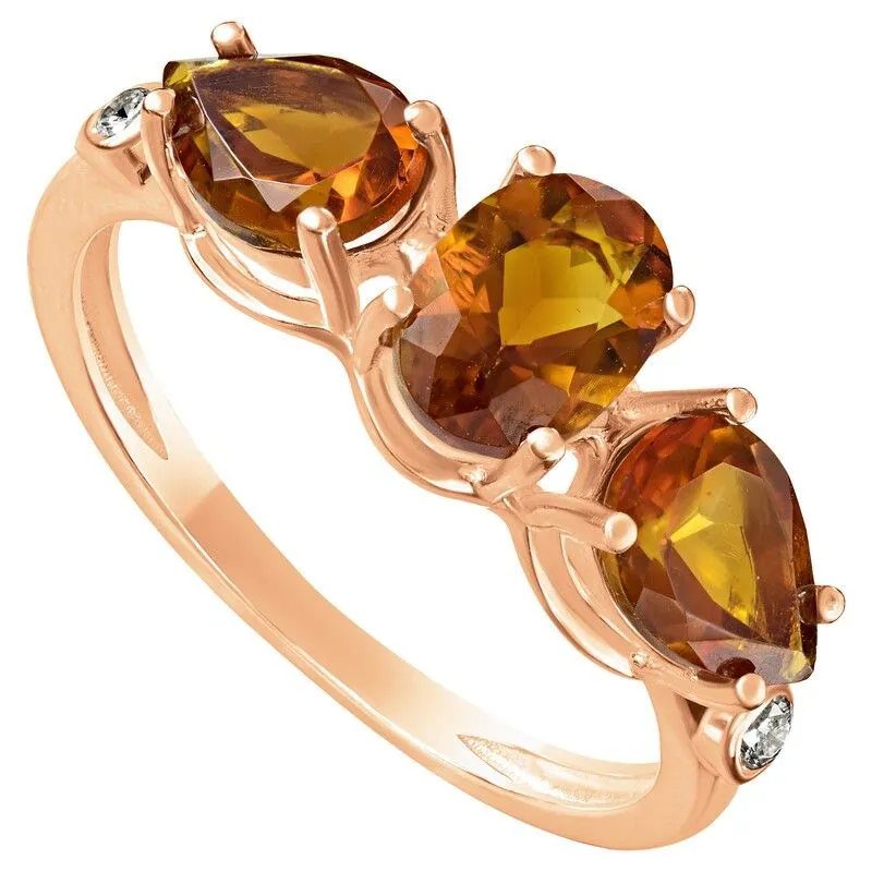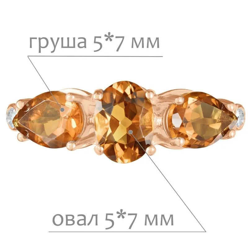 Серебряное кольцо с натуральным цитрином (мадейра) - коллекция Сансара / покрытие Красное Золото.Средний вес украшения с камнями 2.29 гр.Месторождение(я): Цитрин (Урал, Россия).Ювелирные вставки:Цитрин (Натуральный) овал 5*7 мм., средний вес: 0.73 карат.Цитрин (Натуральный) груша 5*7 мм., средний вес: 0.61 карат.Белый Нанокристалл круг 2 мм., средний вес: 0.06 карат.Все изделия собственного производства и имеют гарантию 12 месяцев. Арт. 8640RG. Цитрин – камень, который активно использовался для инкрустации. С его помощью излечивали заболевания желудочно-кишечного тракта, он становился амулетом, приносящим удачу. Золотисто-жёлтый камень известен и любим очень давно за ряд своих положительных качеств.