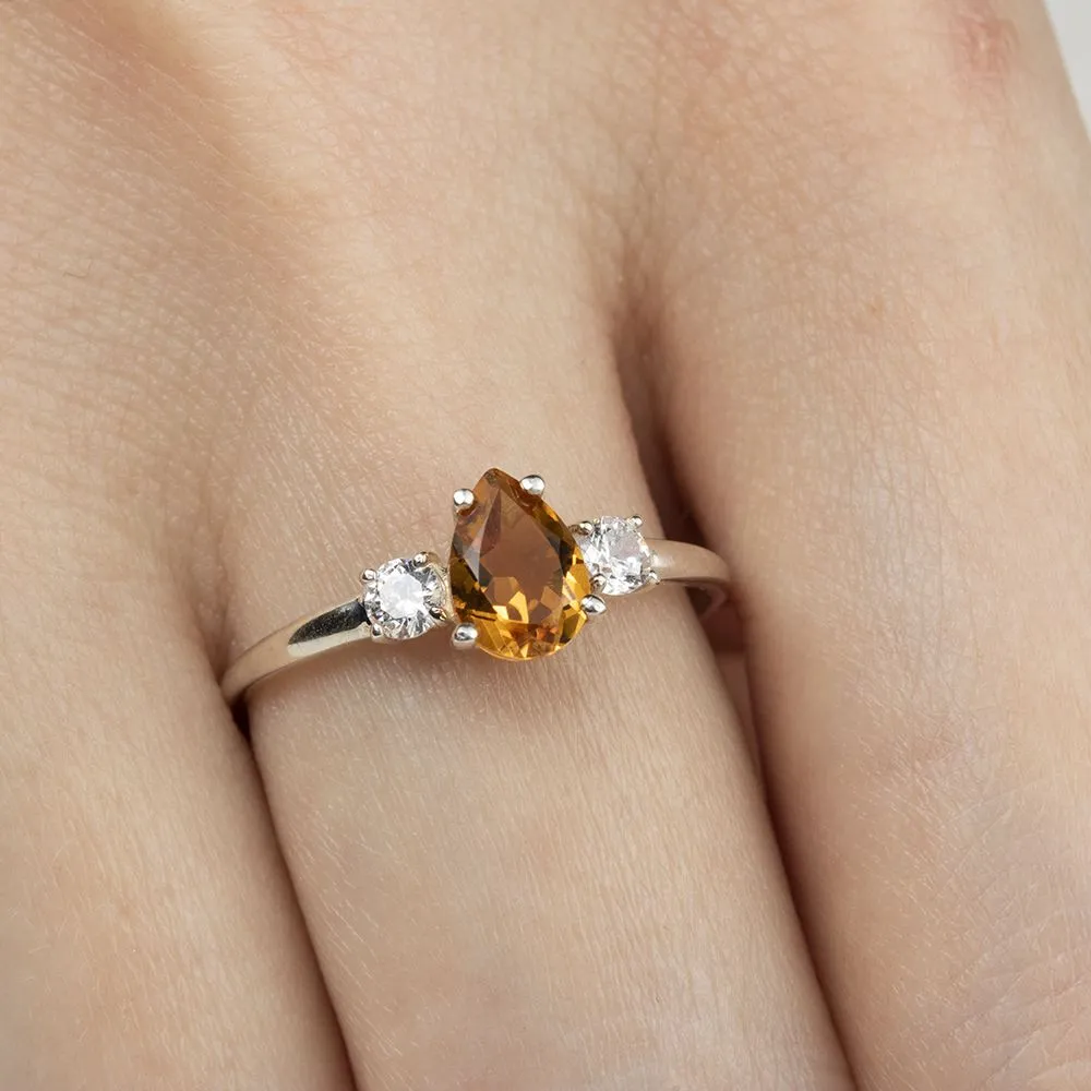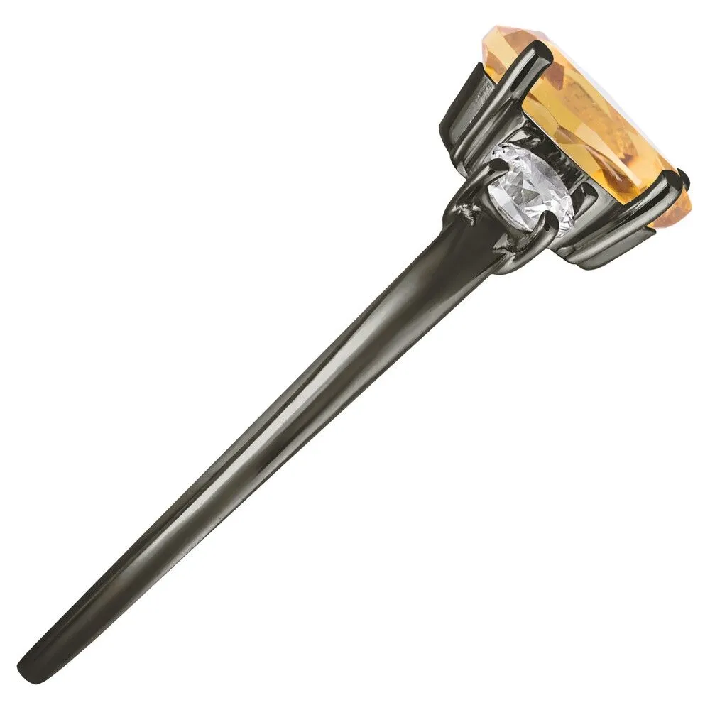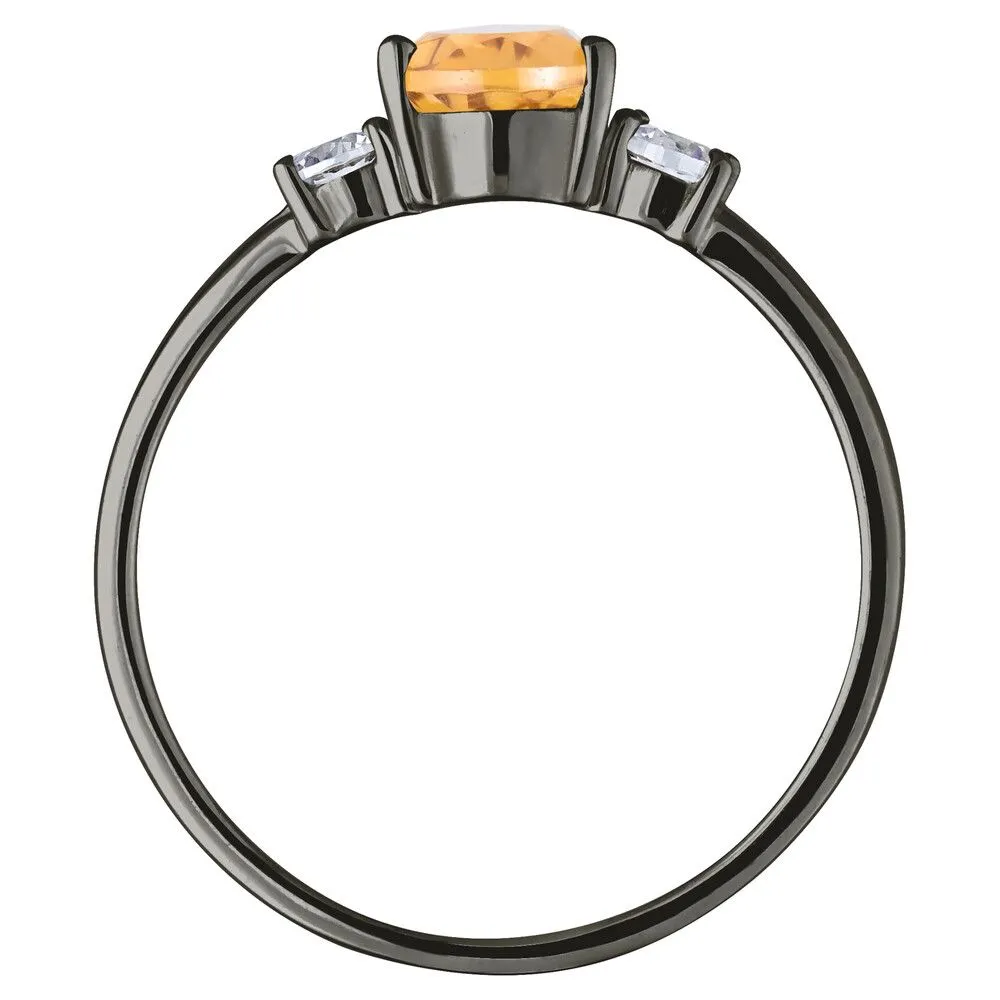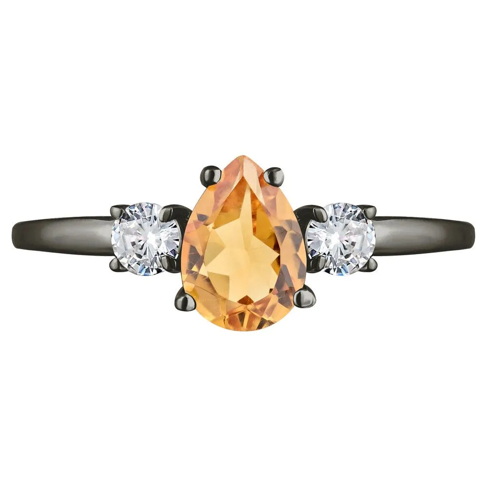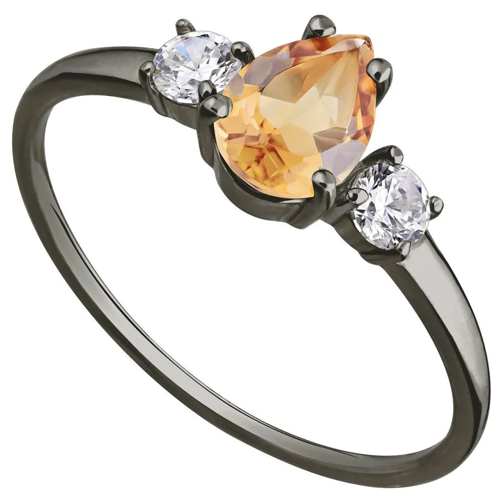 Серебряное кольцо с натуральным цитрином - коллекция Алсу (малая) / Черный Родий. Средний вес украшения с камнями 1.35 гр. Месторождение: Цитрин (Замбия, Восточная Африка). Ювелирные вставки: Цитрин (Натуральный) груша 5*7 мм., средний вес: 0.6 карат. Белый Нанокристалл круг 3 мм. Все изделия собственного производства и имеют гарантию 12 месяцев, к каждому изделию прилагается паспорт. Арт. 8807BR