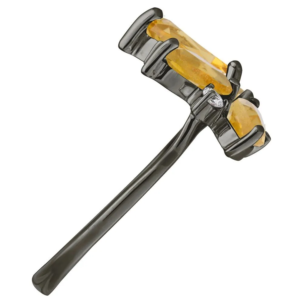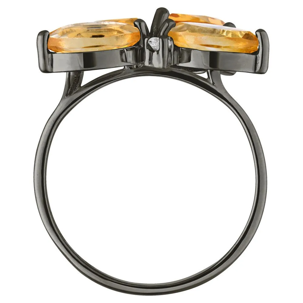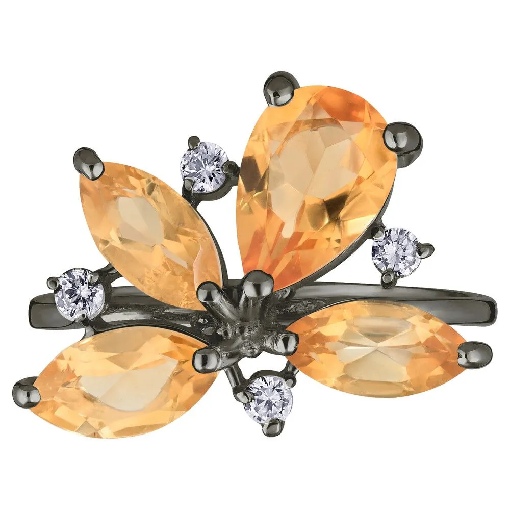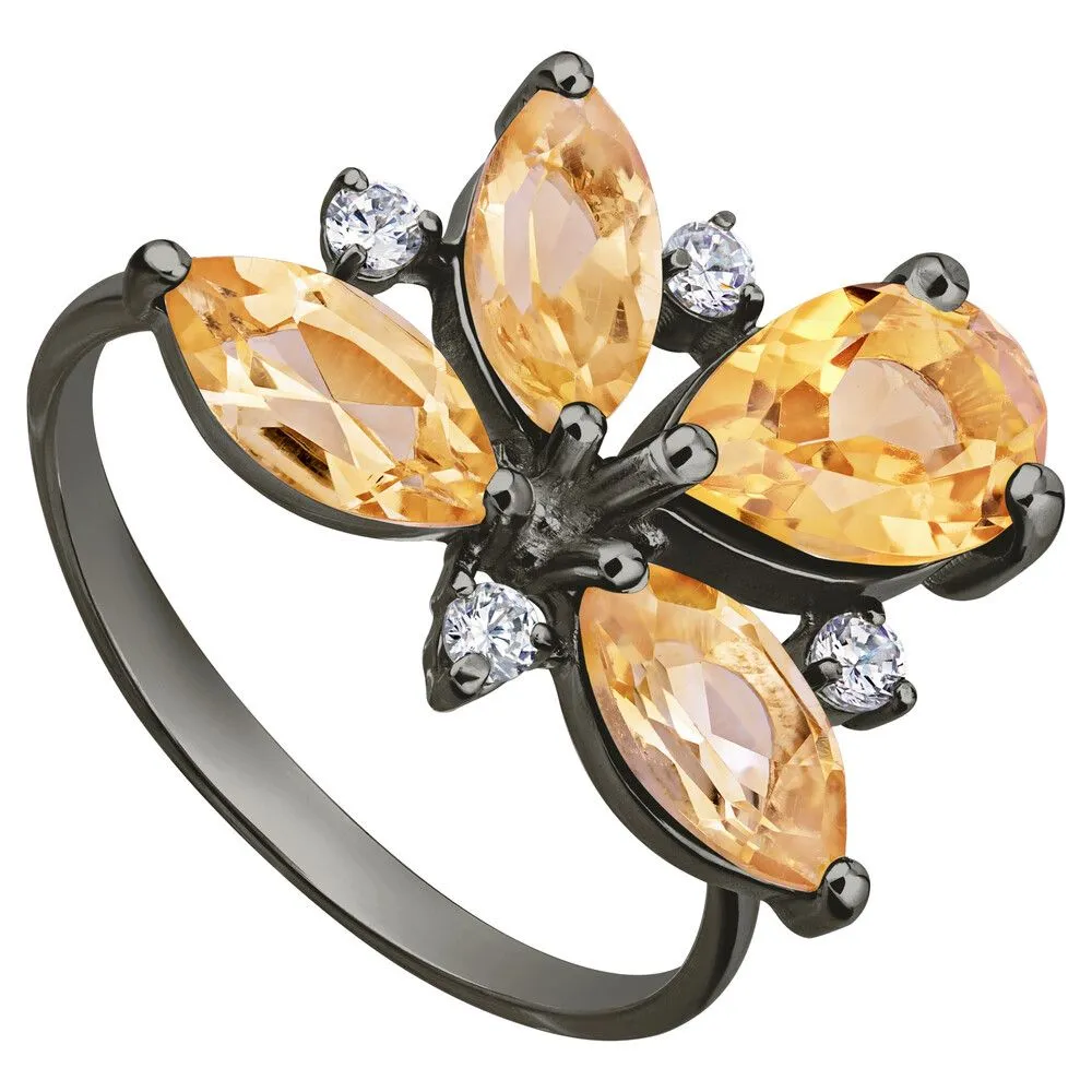 Серебряное кольцо с натуральным цитрином - коллекция Аврора / Черный Родий. Средний вес украшения с камнями 3.18 гр. Месторождение: Цитрин (Замбия, Восточная Африка). Ювелирные вставки: Цитрин (Натуральный) груша 6*9 мм., средний вес: 1.14 карат. Цитрин (Натуральный) маркиз 4*8 мм., средний вес: 0.53 карат. Белый Нанокристалл круг 2 мм. Все изделия собственного производства и имеют гарантию 12 месяцев, к каждому изделию прилагается паспорт. Арт. 8907BR