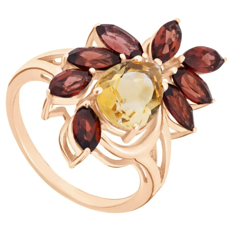 Стильное серебряное кольцо "Элегия", с натуральными камнями цитрин и гранат, покрытие Красное Золото. Средний вес украшения с камнями: 3,8 гр. Месторождение(я) камней: Цитрин (Урал, Россия), Гранат (Кольский п-ов, Россия). Цитрин (Натуральный) груша: 7*10 мм. средний вес 1,85 карат. Гранат (Натуральный) маркиз: 3*6 мм., средний вес 0,35 карат. Размер лицевой части: 15*23 мм. Все изделия собственного производства и имеют гарантию 12 месяцев, к каждому изделию прилагается паспорт. Арт. 6212RG
