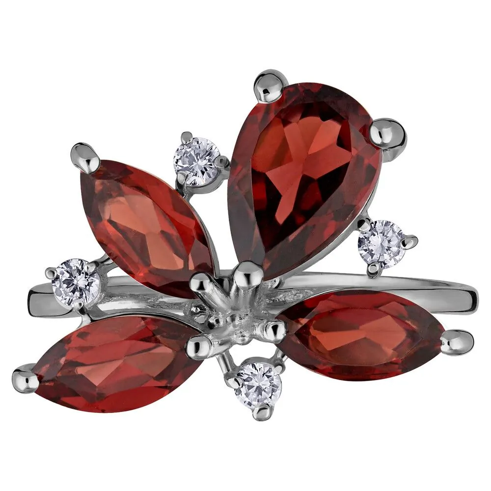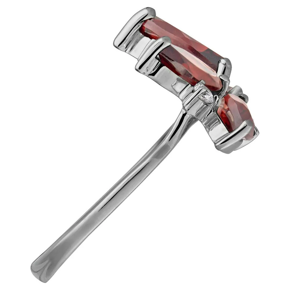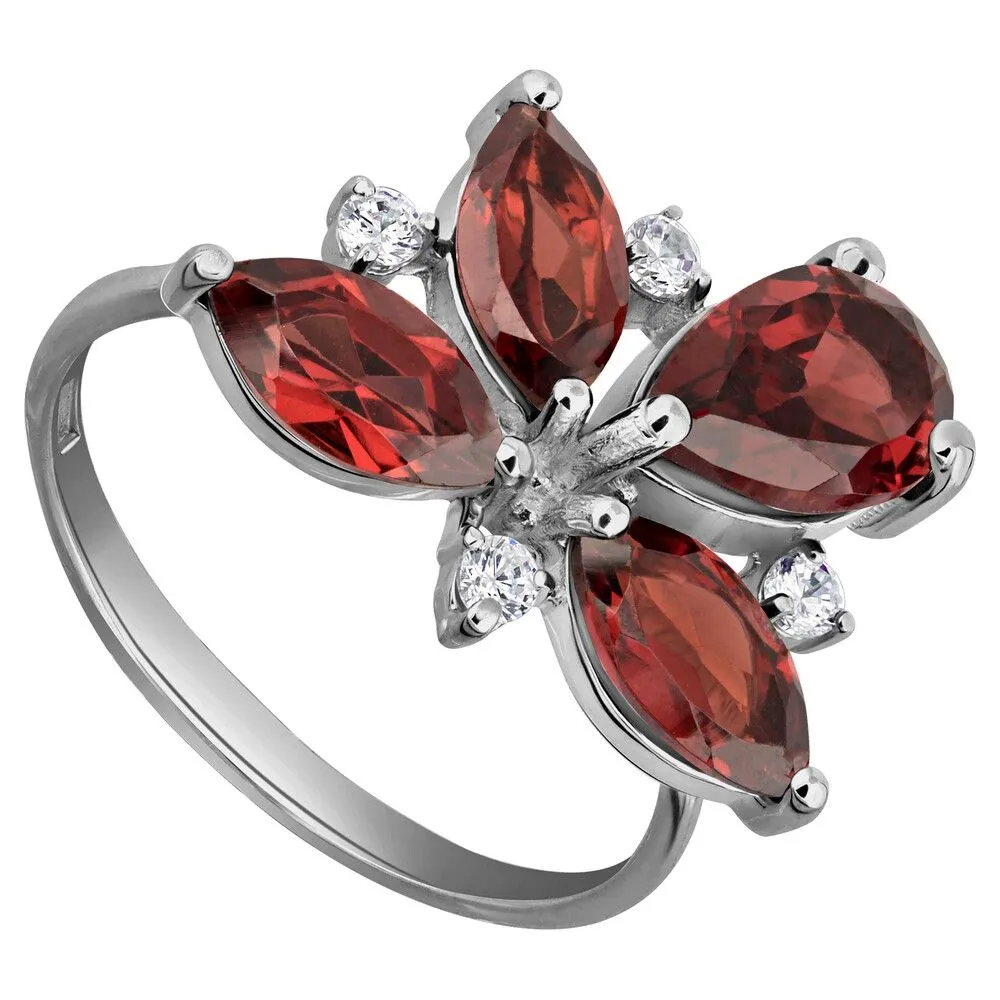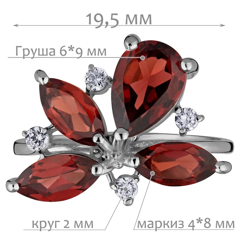 Серебряное кольцо с натуральным гранатом - коллекция Аврора / Палладий. Средний вес украшения с камнями 3.48 гр. Месторождение: Гранат (Кольский п-ов, Россия). Ювелирные вставки: Гранат (Натуральный) груша 6*9 мм., средний вес: 1.45 карат. Гранат (Натуральный) маркиз 4*8 мм., средний вес: 0.61 карат. Белый Нанокристалл круг 2 мм. Все изделия собственного производства и имеют гарантию 12 месяцев, к каждому изделию прилагается паспорт. Арт. 6622PD