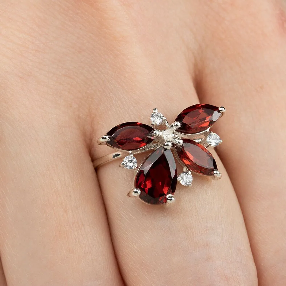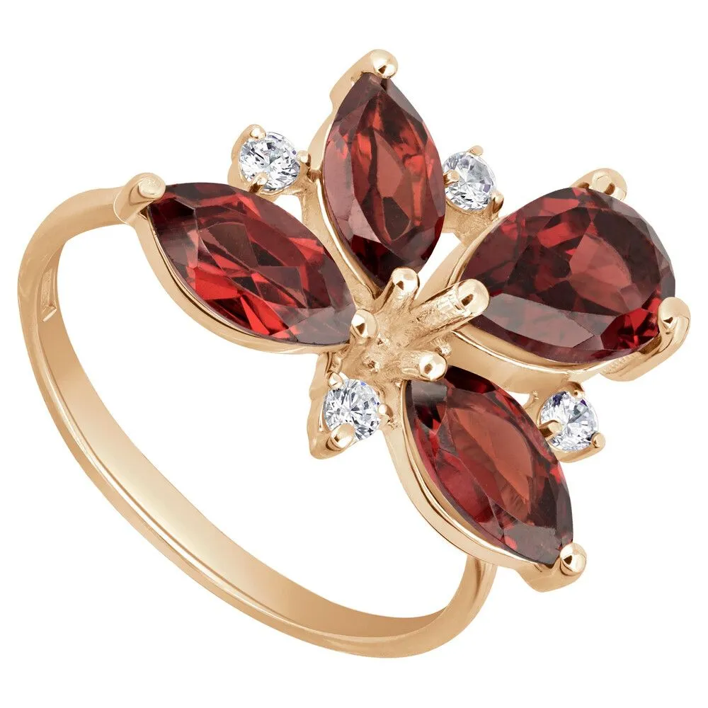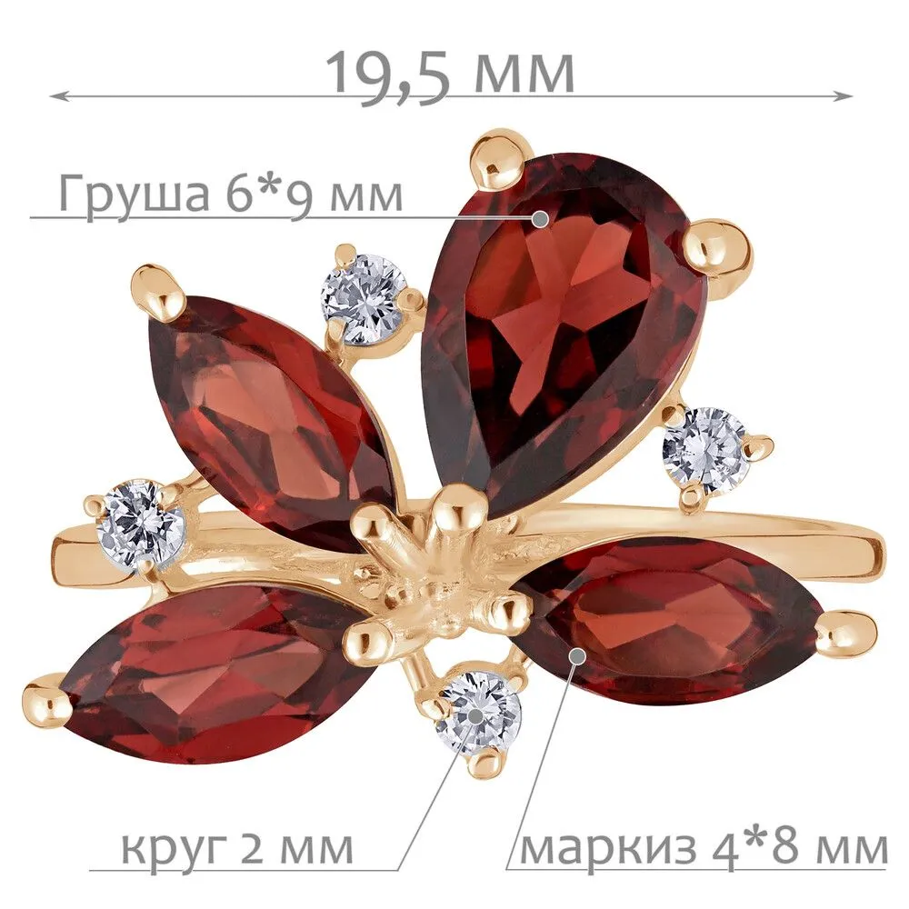 Серебряное кольцо с натуральным гранатом - коллекция Аврора / Розовое Золото. Средний вес украшения с камнями 3.48 гр. Месторождение: Гранат (Кольский п-ов, Россия). Ювелирные вставки: Гранат (Натуральный) груша 6*9 мм., средний вес: 1.45 карат. Гранат (Натуральный) маркиз 4*8 мм., средний вес: 0.61 карат. Белый Нанокристалл круг 2 мм. Все изделия собственного производства и имеют гарантию 12 месяцев, к каждому изделию прилагается паспорт. Арт. 6622PG