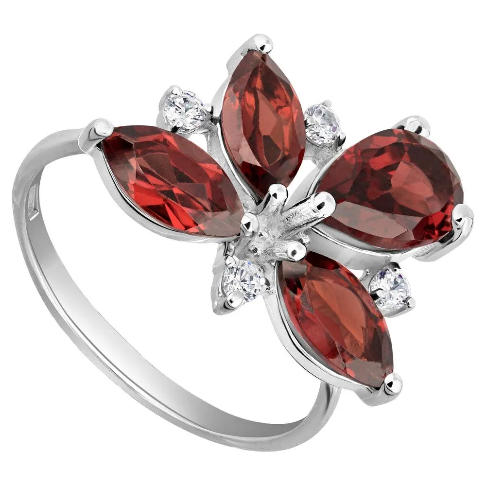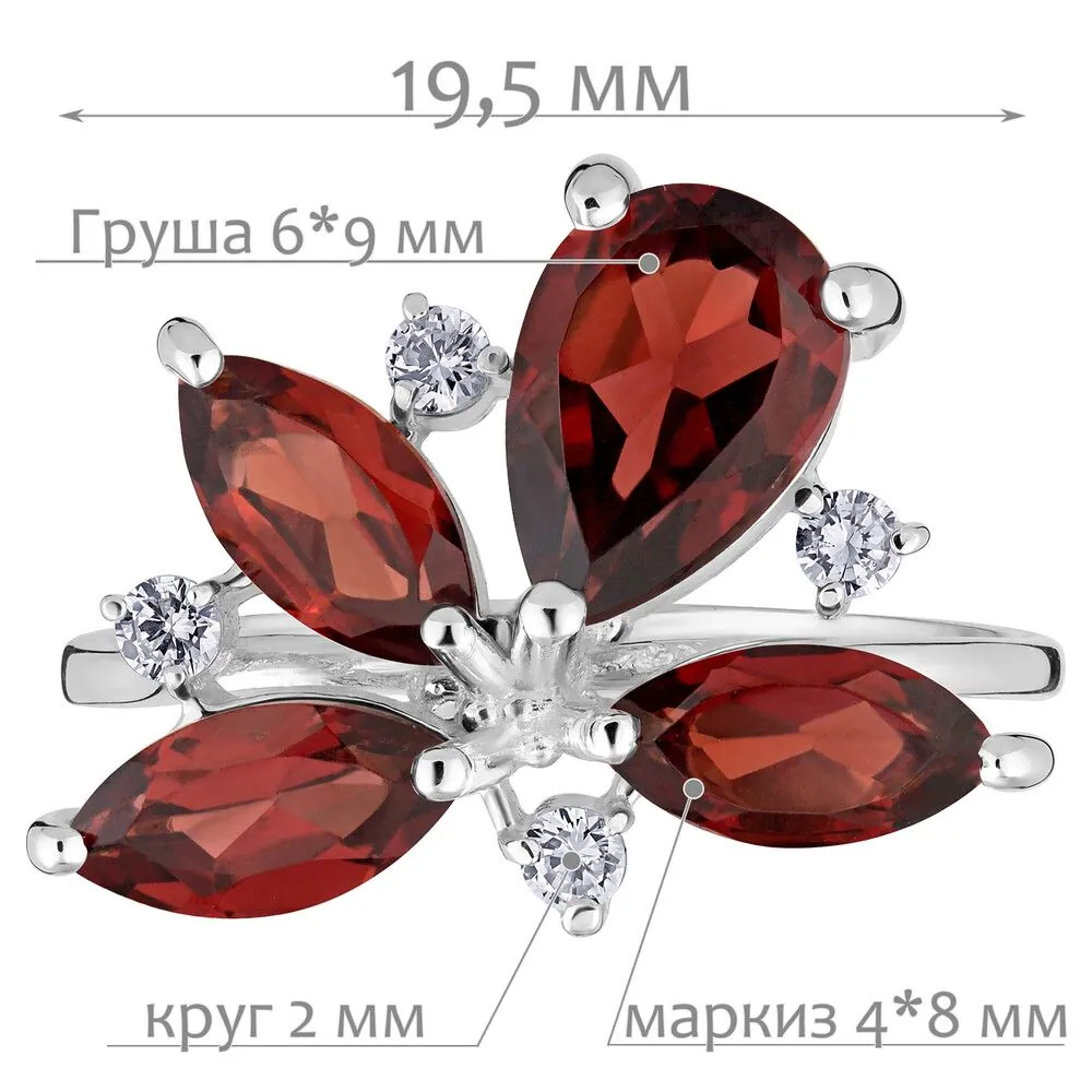 Серебряное кольцо с натуральным гранатом - коллекция Аврора / Белый Родий. Средний вес украшения с камнями 3.48 гр. Месторождение: Гранат (Кольский п-ов, Россия). Ювелирные вставки: Гранат (Натуральный) груша 6*9 мм., средний вес: 1.45 карат. Гранат (Натуральный) маркиз 4*8 мм., средний вес: 0.61 карат. Белый Нанокристалл круг 2 мм. Все изделия собственного производства и имеют гарантию 12 месяцев, к каждому изделию прилагается паспорт. Арт. 6622WR