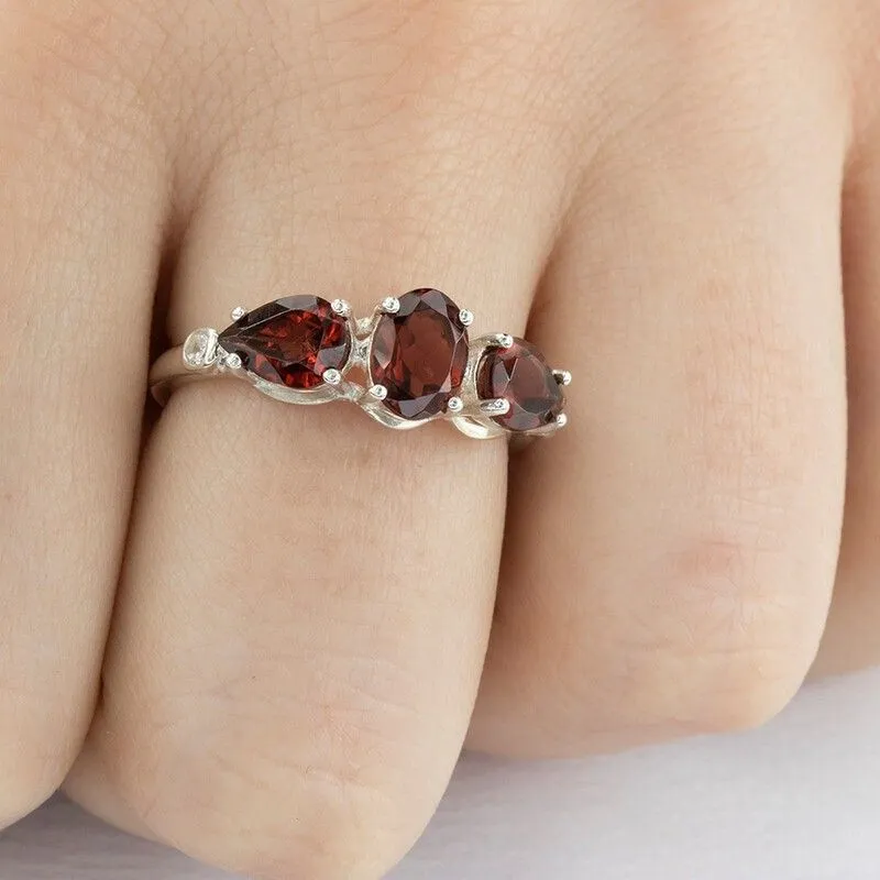 Серебряное кольцо с натуральным гранатом - коллекция Сансара / Без покрытия.Средний вес украшения с камнями 2.24 гр.Месторождение(я): Гранат (Кольский п-ов, Россия).Ювелирные вставки:Гранат (Натуральный) овал 5*7 мм., средний вес: 0.95 карат.Гранат (Натуральный) груша 5*7 мм., средний вес: 0.79 карат.Белый Нанокристалл круг 2 мм., средний вес: 0.06 карат.Все изделия собственного производства и имеют гарантию 12 месяцев. Арт. 8644NP. Гранат называют камнем любви. Он дарит своим обладательницам мудрость, а владельцам – решительность и храбрость. Данному камню присущи лечебные свойства, давным-давно он использовался при ранениях. Считалось, что он помогает поддерживать связь с миром мертвых.