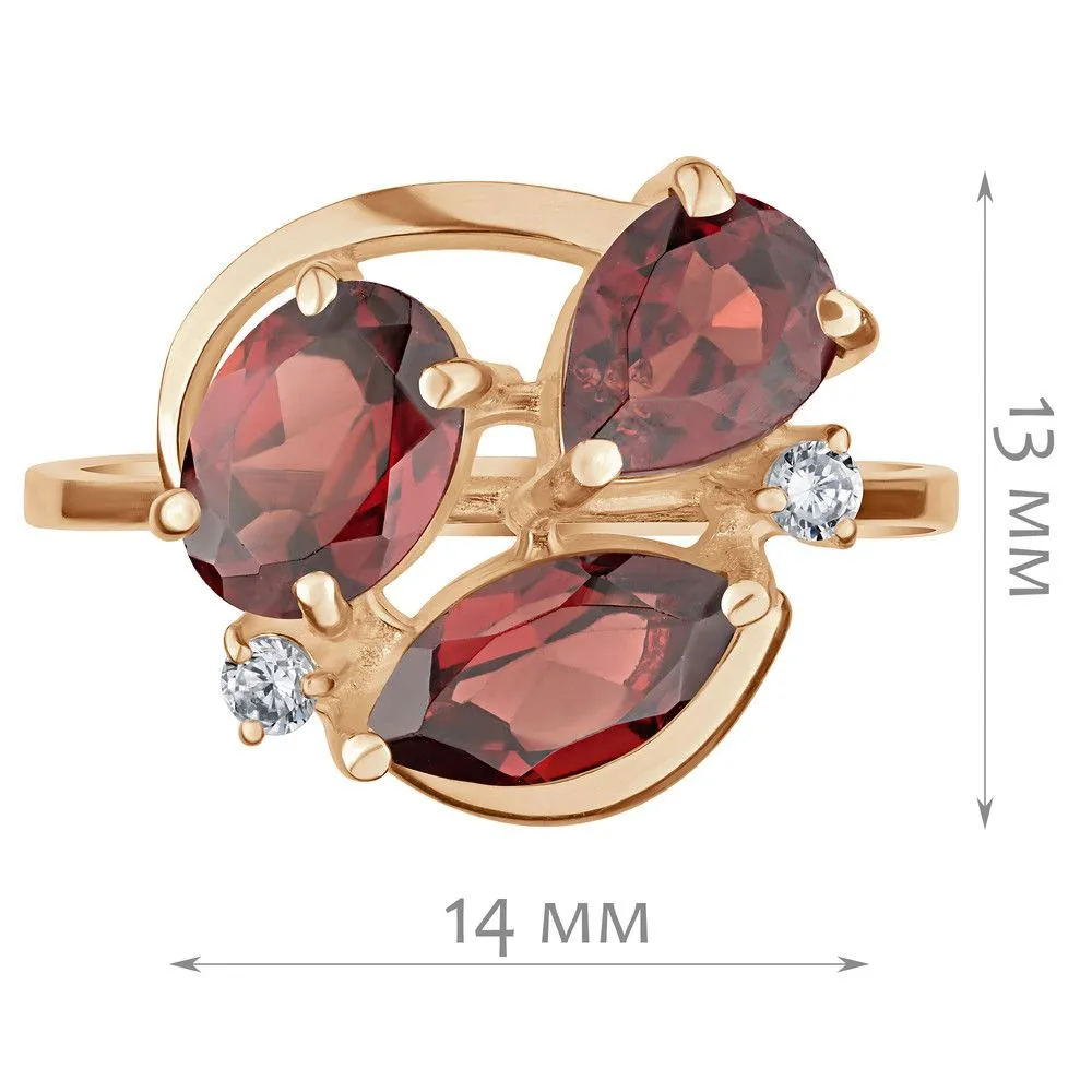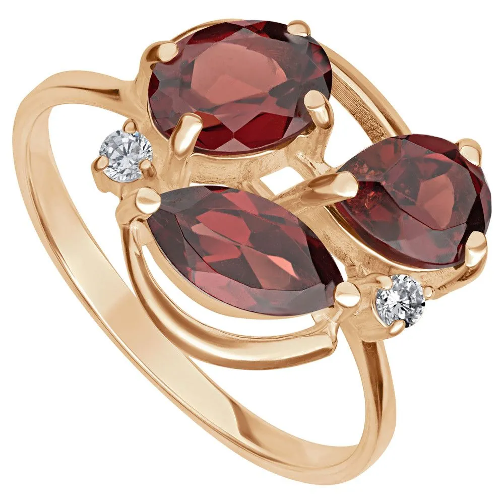 Серебряное кольцо с натуральным гранатом - коллекция Фортуна / покрытие Розовое Золото. Средний вес украшения с камнями 2.97 гр. Месторождение: Гранат (Кольский п-ов, Россия) Ювелирные вставки: Гранат (Натуральный) груша 5*7 мм., средний вес: 0.79 карат. Гранат (Натуральный) овал 5*7 мм., средний вес: 0.95 карат. (Натуральный) круг 2 мм., средний вес: 0.06 карат. Все изделия собственного производства и имеют гарантию 12 месяцев. Арт. 8772PG. Гранат называют камнем любви. Он дарит своим обладательницам мудрость, а владельцам – решительность и храбрость. Данному камню присущи лечебные свойства, давным-давно он использовался при ранениях. Считалось, что он помогает поддерживать связь с миром мертвых.
