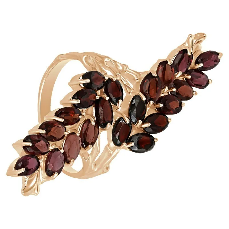 Серебряное кольцо с натуральным гранатом - коллекция Флора. Серебряное кольцо 925 пробы с покрытием розовое золото. Цвет покрытия соответствует швейцарскому цветовому стандарту NIHS -4N и цвету розового золота 585 в России. На последней фотографии мы разместили сравнительную фотографию 3 цвета золотого покрытия. Помимо предания золотого цвета Вашему изделию, тонкий слой золота защищает от окисления. Для более стойкого эффекта золочения и долговечности покрытия мы дополнительно наносим подслой палладия (Pd). Средний вес изделия с камнями 5.77 гр. Месторождение(я): Гранат (Кольский п-ов, Россия). Гранат (Натуральный) овал 3*5 мм., средний вес: 0.37 карат. Размер лицевой части: 15*44 мм. Все изделия собственного производства, гарантия 12 месяцев. Арт. 7864