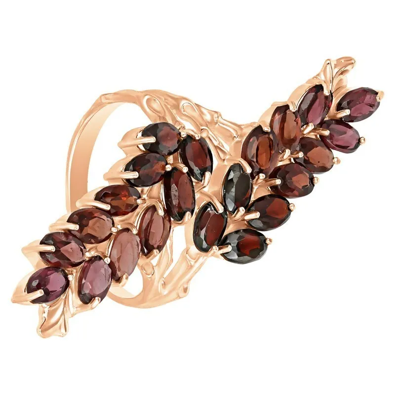 Серебряное кольцо с натуральным гранатом - коллекция Флора. Серебряное кольцо 925 пробы с покрытием красное золото. Цвет покрытия соответствует швейцарскому цветовому стандарту NIHS -5N и цвету красного золота 585 в России. На последней фотографии мы разместили сравнительную фотографию 3 цвета золотого покрытия. Помимо предания золотого цвета Вашему изделию, тонкий слой золота защищает от окисления. Для более стойкого эффекта золочения и долговечности покрытия мы дополнительно наносим подслой палладия (Pd). Средний вес изделия с камнями 5.77 гр. Месторождение(я): Гранат (Кольский п-ов, Россия). Гранат (Натуральный) овал 3*5 мм., средний вес: 0.37 карат. Размер лицевой части: 15*44 мм. Все изделия собственного производства, гарантия 12 месяцев. Арт. 7864