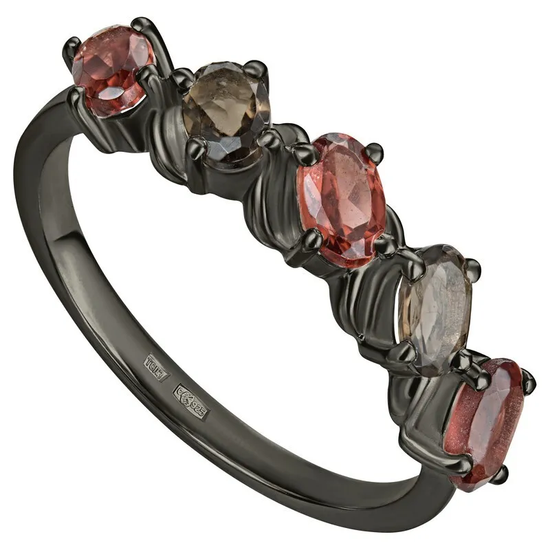 Серебряное кольцо с натуральными камнями гранат и раухтопаз - коллекция Колосок, покрытие Черный Родий.