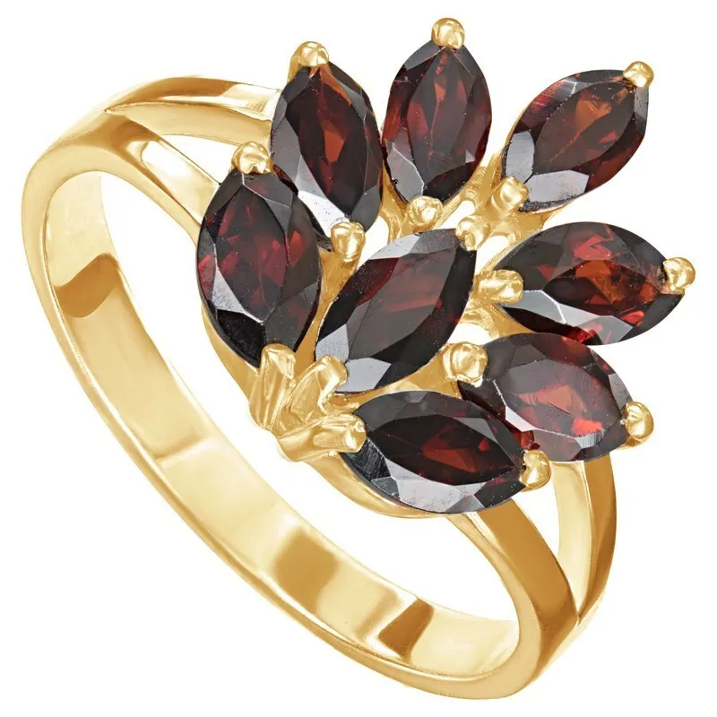 Серебряное кольцо с натуральным гранатом - коллекция Искра. Серебряное кольцо 925 пробы с покрытием желтое золото. Цвет покрытия соответствует швейцарскому цветовому стандарту NIHS -FF24ct и цвету чистого золото 999.99. На последней фотографии мы разместили сравнительную фотографию 3 цвета золотого покрытия. Помимо предания золотого цвета Вашему изделию, тонкий слой золота защищает от окисления. Для более стойкого эффекта золочения и долговечности покрытия мы дополнительно наносим подслой палладия (Pd). Средний вес изделия с камнями 2.98 гр. Месторождение: Гранат (Кольский п-ов, Россия). Гранат (Натуральный) маркиз 3*6 мм., средний вес: 0.33 карат. Все изделия собственного производства, гарантия 12 месяцев. Арт. 8077
