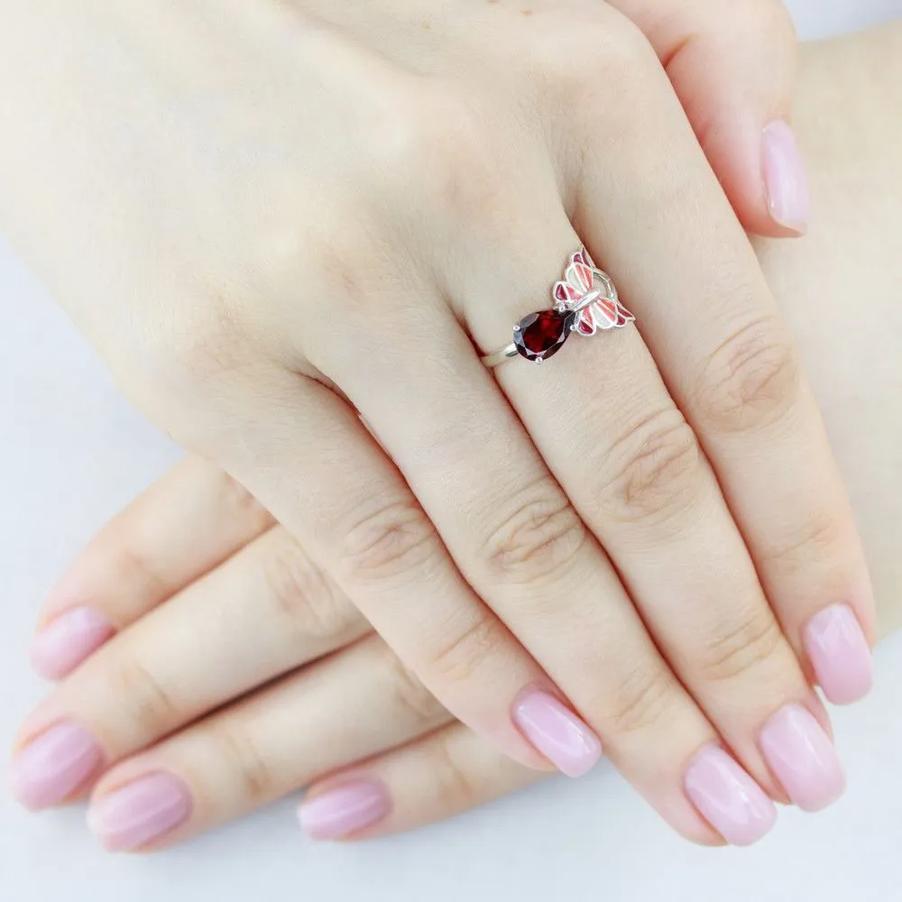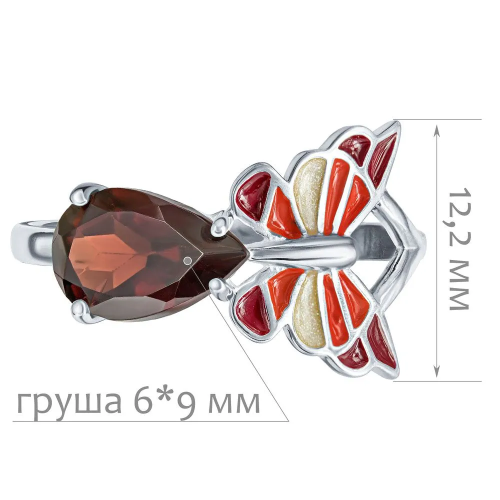 Серебряное кольцо с натуральным гранатом и эмалью - коллекция Бабочка, покрытие Чистое Серебро. Средний вес украшения с камнями 2.34 гр. Месторождение: Гранат (Кольский п-ов, Россия). Гранат (Натуральный) груша 6*9 мм., средний вес: 1.55 карат. Все изделия собственного производства и имеют гарантию 12 месяцев, к каждому изделию прилагается паспорт. Арт. 8451AG. Гранат называют камнем любви. Он дарит своим обладательницам мудрость, а владельцам – решительность и храбрость. Данному камню присущи лечебные свойства, давным-давно он использовался при ранениях. Считалось, что он помогает поддерживать связь с миром мертвых.