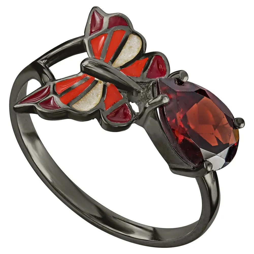 Серебряное кольцо с натуральным гранатом и эмалью - коллекция Бабочка, покрытие Черный Родий. Средний вес украшения с камнями 2.34 гр. Месторождение: Гранат (Кольский п-ов, Россия). Гранат (Натуральный) груша 6*9 мм., средний вес: 1.55 карат. Все изделия собственного производства и имеют гарантию 12 месяцев, к каждому изделию прилагается паспорт. Арт. 8451BR. Гранат называют камнем любви. Он дарит своим обладательницам мудрость, а владельцам – решительность и храбрость. Данному камню присущи лечебные свойства, давным-давно он использовался при ранениях. Считалось, что он помогает поддерживать связь с миром мертвых.