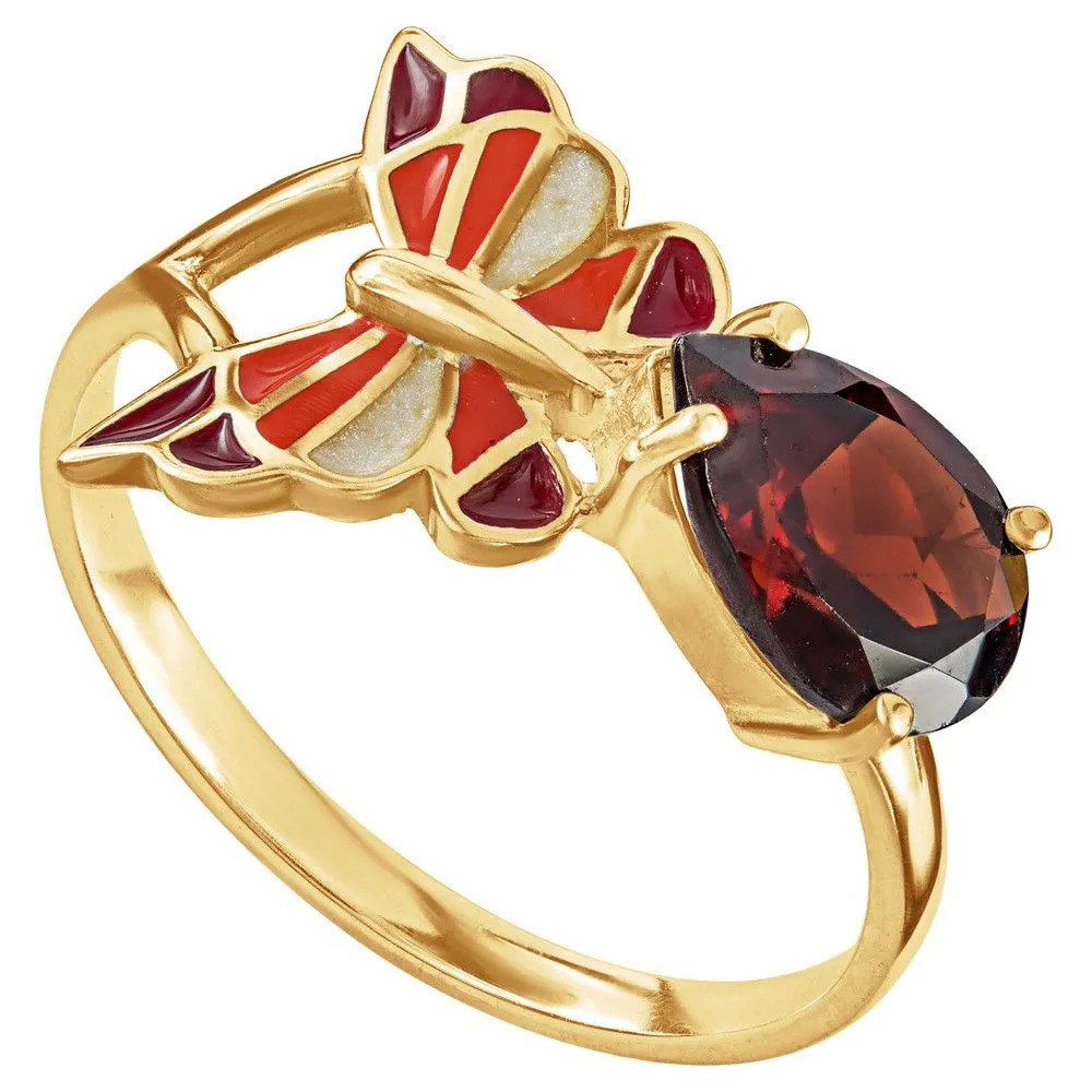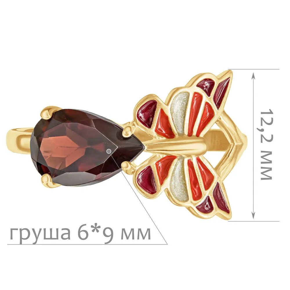Серебряное кольцо с натуральным гранатом и эмалью - коллекция Бабочка, покрытие Желтое Золото. Средний вес украшения с камнями 2.34 гр. Месторождение: Гранат (Кольский п-ов, Россия). Гранат (Натуральный) груша 6*9 мм., средний вес: 1.55 карат. Все изделия собственного производства и имеют гарантию 12 месяцев, к каждому изделию прилагается паспорт. Арт. 8451YG. Гранат называют камнем любви. Он дарит своим обладательницам мудрость, а владельцам – решительность и храбрость. Данному камню присущи лечебные свойства, давным-давно он использовался при ранениях. Считалось, что он помогает поддерживать связь с миром мертвых.