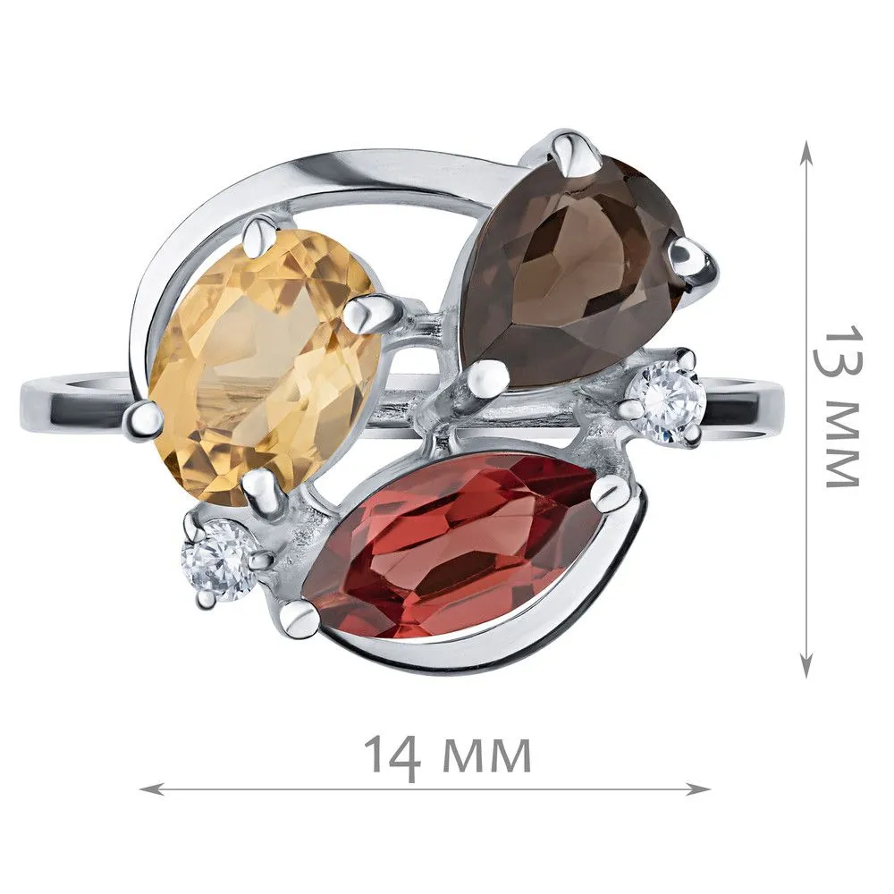 Серебряное кольцо "Фортуна" с натуральными камнями цитрин, раухтопаз и гранат, покрытие Чистое Серебро. Средний вес украшения с камнями 3,16 гр. Месторождение(я) камней: Цитрин (Урал, Россия), Раухтопаз (Дымчатый кварц) (м-ние Додо ХМАО, Россия), Гранат (Кольский п-ов, Россия). Гранат (Натуральный) маркиз: 4*8 мм., средний вес 0,75 карат. Цитрин (Натуральный) овал: 5*7 мм., средний вес 0,80 карат. Раухтопаз (Натуральный) груша: 5*7 мм., средний вес 0,70 карат. Циркон белый (Натуральный) круг: 2 мм., средний вес 0,05 карат. Размер лицевой части: 13*15 мм. Все изделия собственного производства и имеют гарантию 12 месяцев. Арт. 6617AG