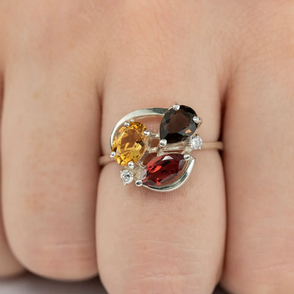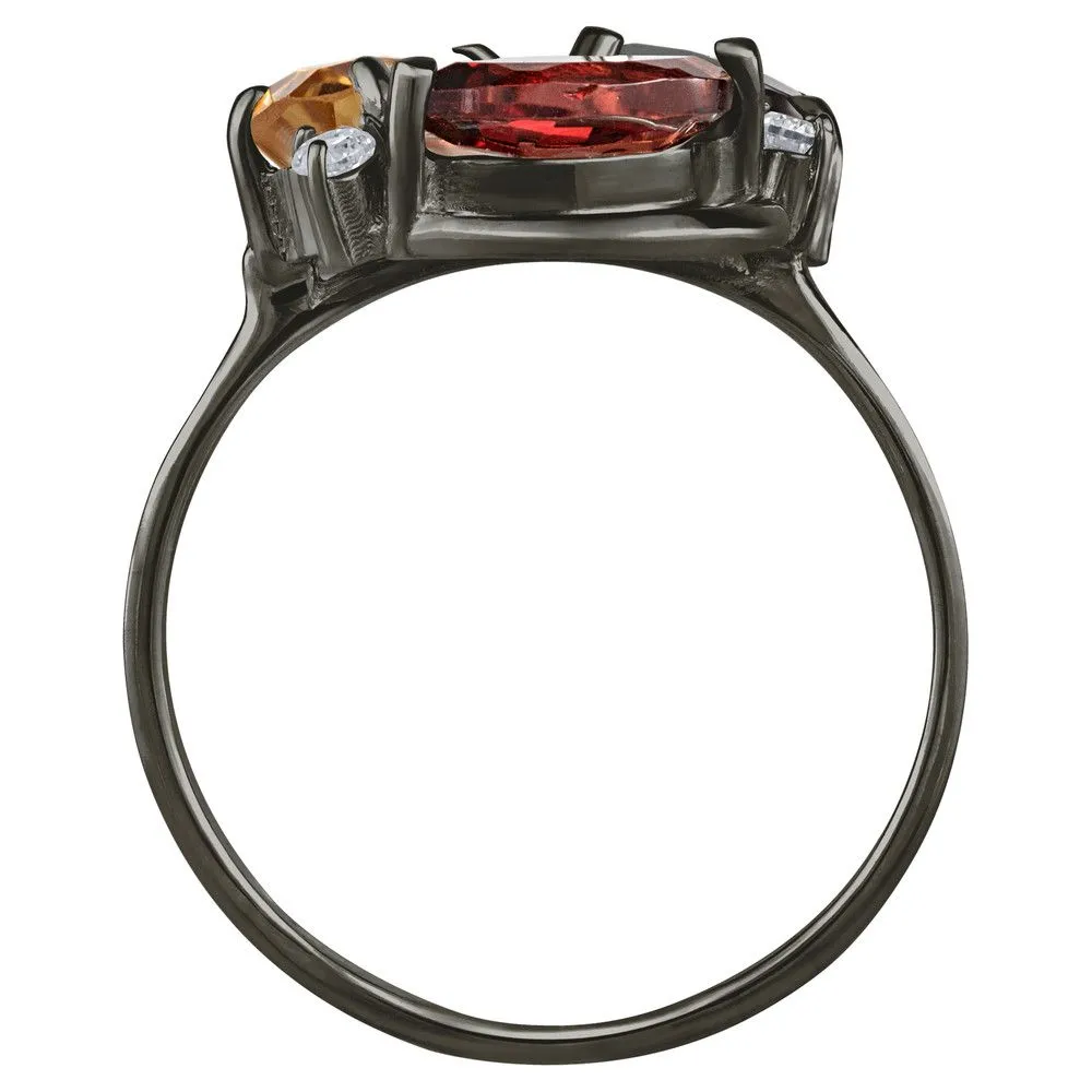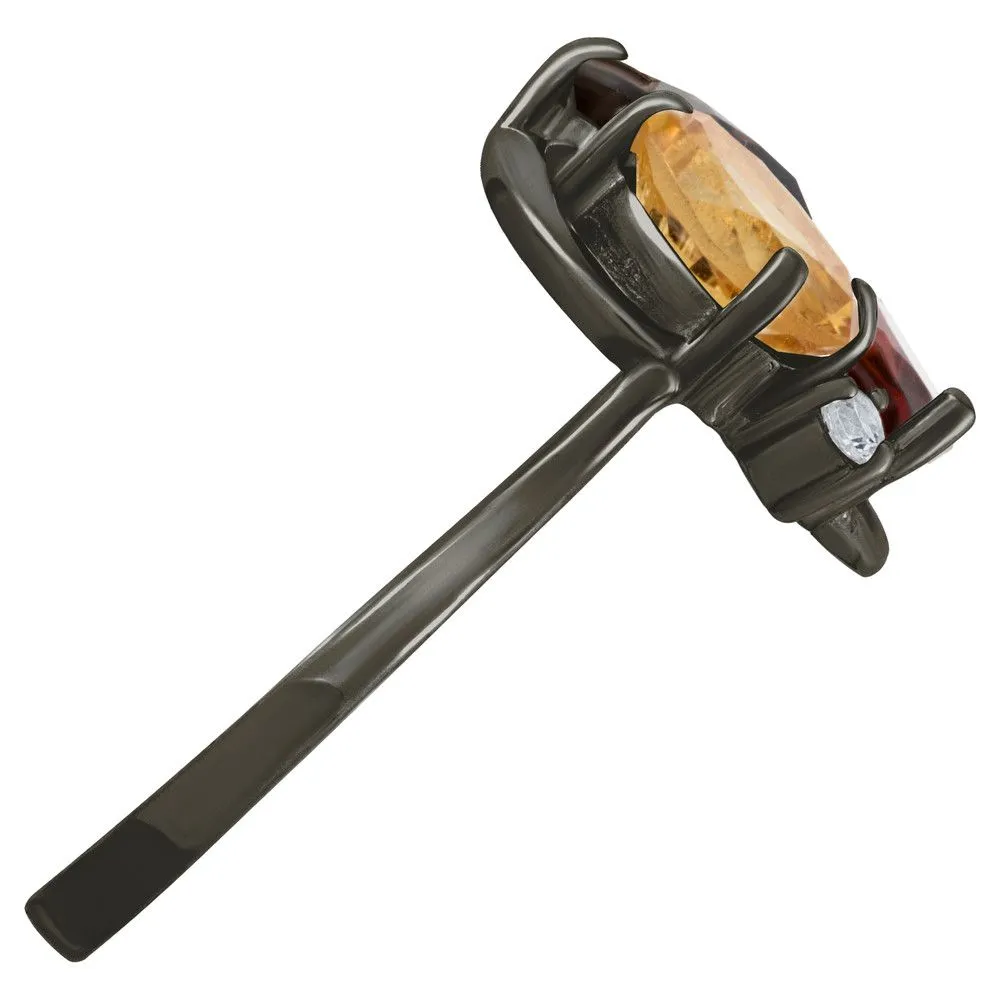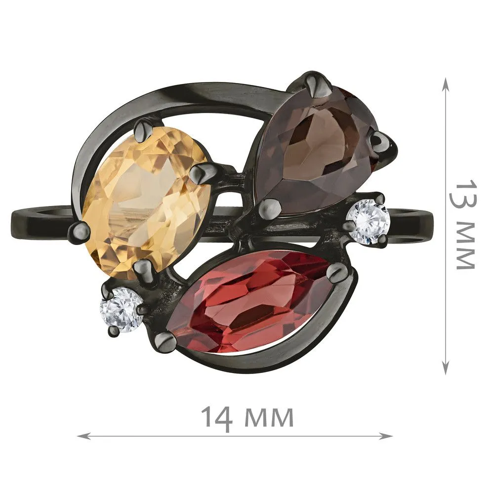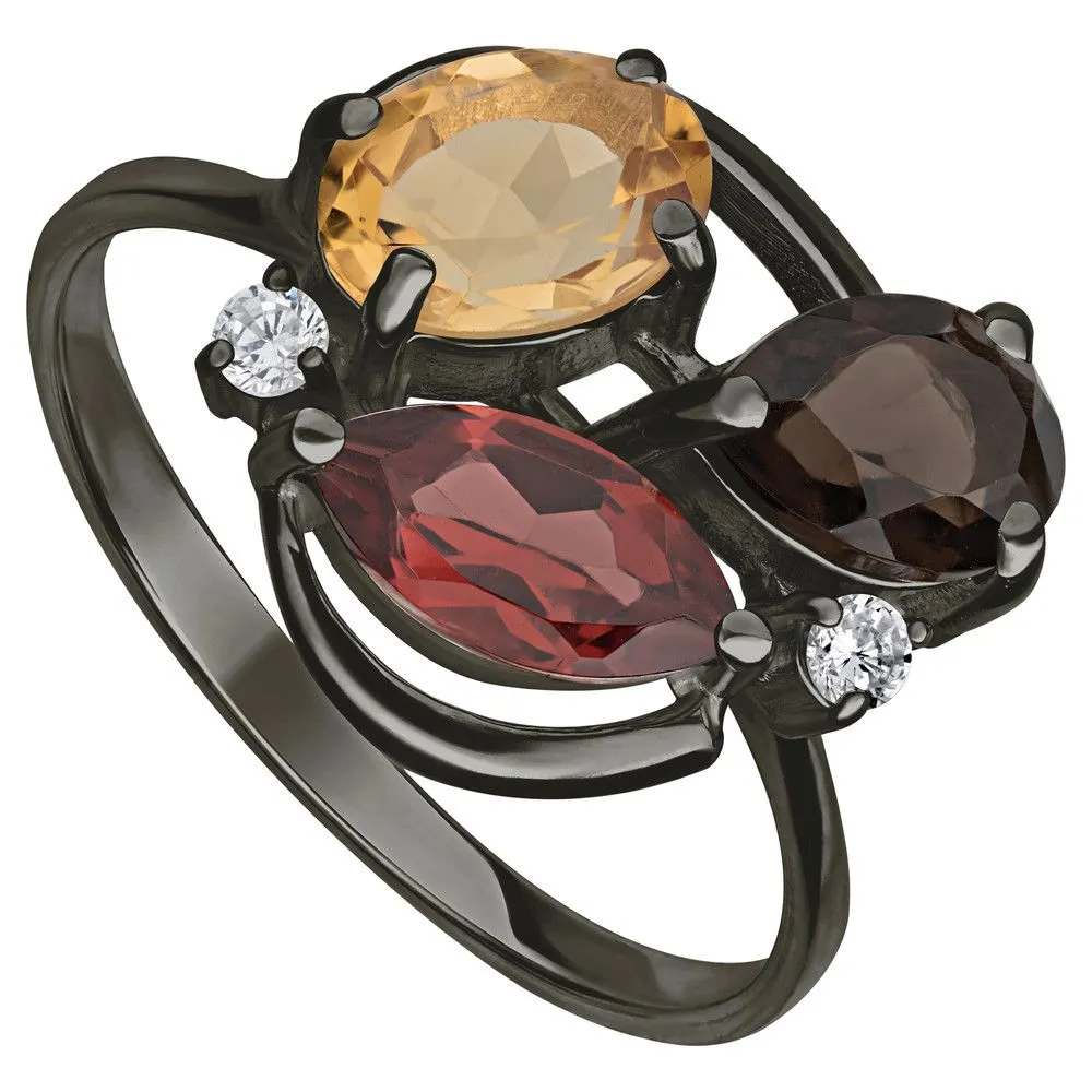 Серебряное кольцо "Фортуна" с натуральными камнями цитрин, раухтопаз и гранат, покрытие Черный Родий. Средний вес украшения с камнями 3,16 гр. Месторождение(я) камней: Цитрин (Урал, Россия), Раухтопаз (Дымчатый кварц) (м-ние Додо ХМАО, Россия), Гранат (Кольский п-ов, Россия). Гранат (Натуральный) маркиз: 4*8 мм., средний вес 0,75 карат. Цитрин (Натуральный) овал: 5*7 мм., средний вес 0,80 карат. Раухтопаз (Натуральный) груша: 5*7 мм., средний вес 0,70 карат. Циркон белый (Натуральный) круг: 2 мм., средний вес 0,05 карат. Размер лицевой части: 13*15 мм. Все изделия собственного производства и имеют гарантию 12 месяцев. Арт. 6617BR