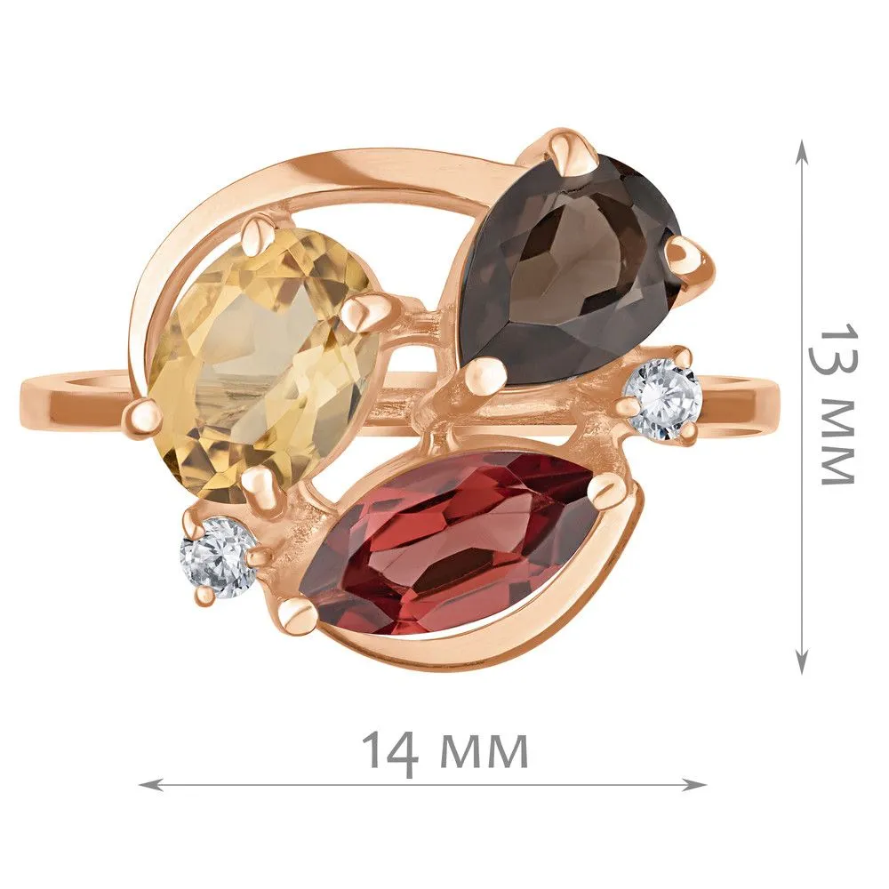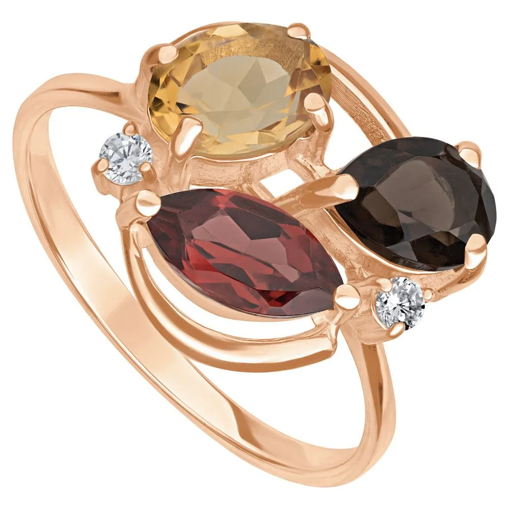Серебряное кольцо "Фортуна" с натуральными камнями цитрин, раухтопаз и гранат, покрытие Красное Золото. Средний вес украшения с камнями 3,16 гр. Месторождение(я) камней: Цитрин (Урал, Россия), Раухтопаз (Дымчатый кварц) (м-ние Додо ХМАО, Россия), Гранат (Кольский п-ов, Россия). Гранат (Натуральный) маркиз: 4*8 мм., средний вес 0,75 карат. Цитрин (Натуральный) овал: 5*7 мм., средний вес 0,80 карат. Раухтопаз (Натуральный) груша: 5*7 мм., средний вес 0,70 карат. Циркон белый (Натуральный) круг: 2 мм., средний вес 0,05 карат. Размер лицевой части: 13*15 мм. Все изделия собственного производства и имеют гарантию 12 месяцев. Арт. 6617RG. Цитрин – камень, который активно использовался для инкрустации. С его помощью излечивали заболевания желудочно-кишечного тракта, он становился амулетом, приносящим удачу. Золотисто-жёлтый камень известен и любим очень давно за ряд своих положительных качеств.