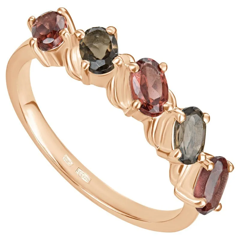 Серебряное кольцо с натуральными камнями гранат и раухтопаз - коллекция Колосок. Серебряное кольцо 925 пробы с покрытием красное золото. Цвет покрытия соответствует швейцарскому цветовому стандарту NIHS -5N и цвету красного золота 585 в России. На последней фотографии мы разместили сравнительную фотографию 3 цвета золотого покрытия. Помимо предания золотого цвета Вашему изделию, тонкий слой золота защищает от окисления. Для более стойкого эффекта золочения и долговечности покрытия мы дополнительно наносим подслой палладия (Pd). Средний вес изделия с камнями 2.31 гр. Месторождения: Гранат (Кольский п-ов, Россия) и Раухтопаз (Дымчатый кварц)(м-ие Додо ХМАО, Россия) Гранат (Натуральный) овал 3*5 мм., средний вес: 0.34 карат. Раухтопаз (Натуральный) овал 3*5 мм., средний вес: 0.32 карат. Все изделия собственного производства, гарантия 12 месяцев. Арт. 8040