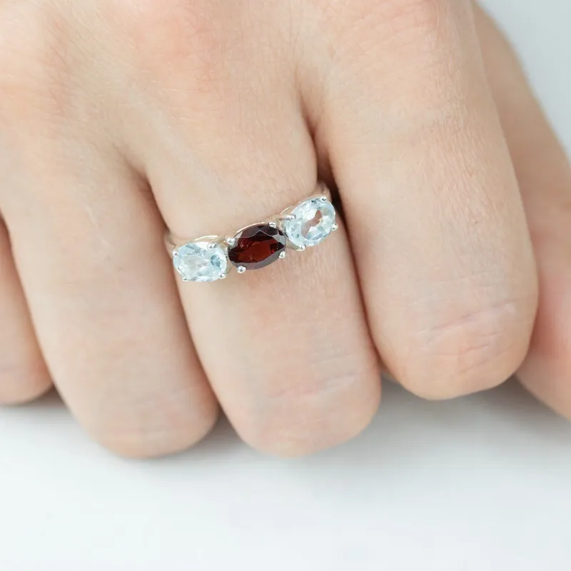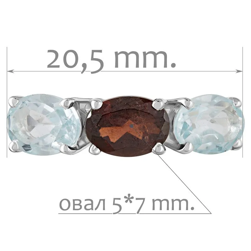 Серебряное кольцо с натуральными камнями гранат и топаз - коллекция Муза. Средний вес изделия с камнями 2.35гр. Месторождение(я): Гранат (Кольский п-ов, Россия) и Голубой топаз (Ильменские горы, Россия). Гранат (Натуральный) овал 5*7 мм., средний вес: 1.06 карат. Топаз (Натуральный) овал 5*7 мм., средний вес: 0.89 карат. Все изделия собственного производства, гарантия 12 месяцев. Арт. 8016
