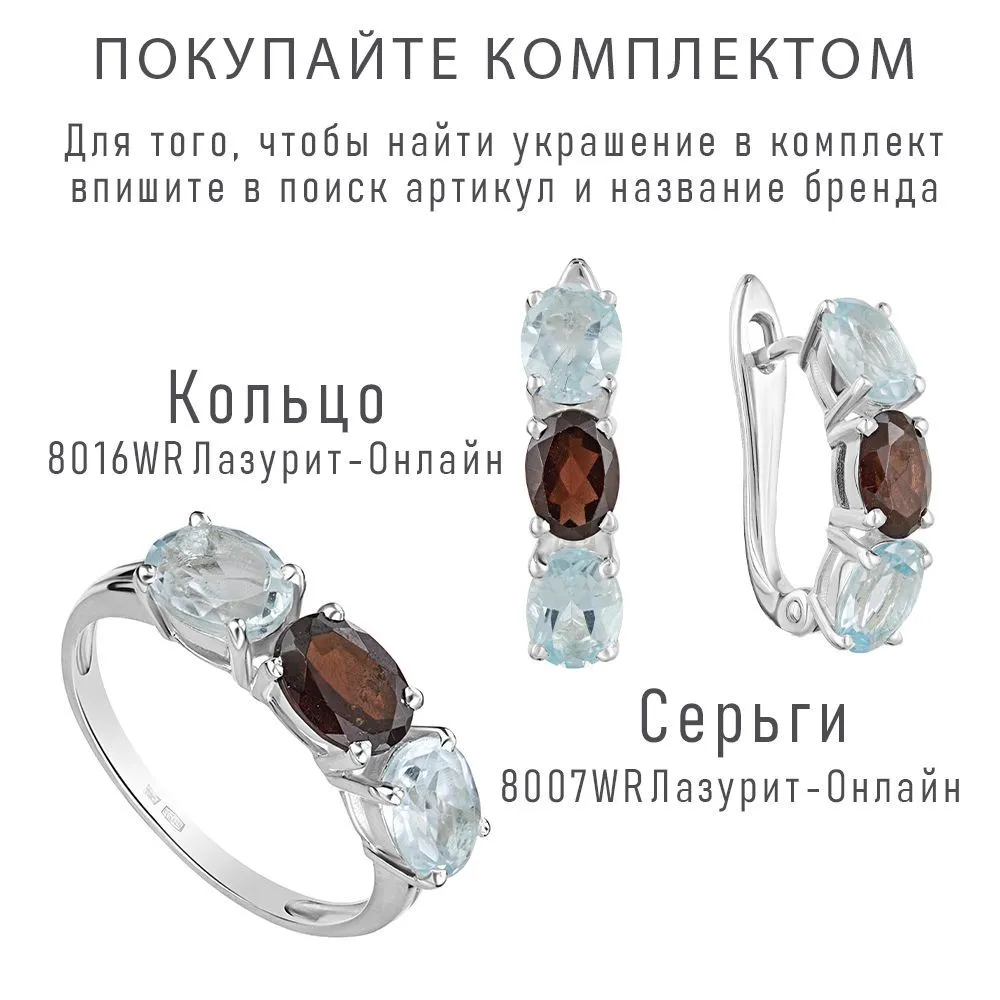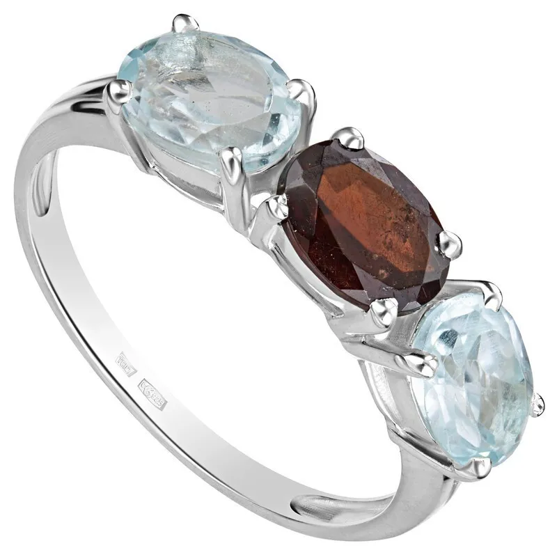 Серебряное кольцо с натуральными камнями гранат и топаз - коллекция Муза. Средний вес изделия с камнями 2.35гр. Месторождение(я): Гранат (Кольский п-ов, Россия) и Голубой топаз (Ильменские горы, Россия). Гранат (Натуральный) овал 5*7 мм., средний вес: 1.06 карат. Топаз (Натуральный) овал 5*7 мм., средний вес: 0.89 карат. Все изделия собственного производства, гарантия 12 месяцев. Арт. 8016