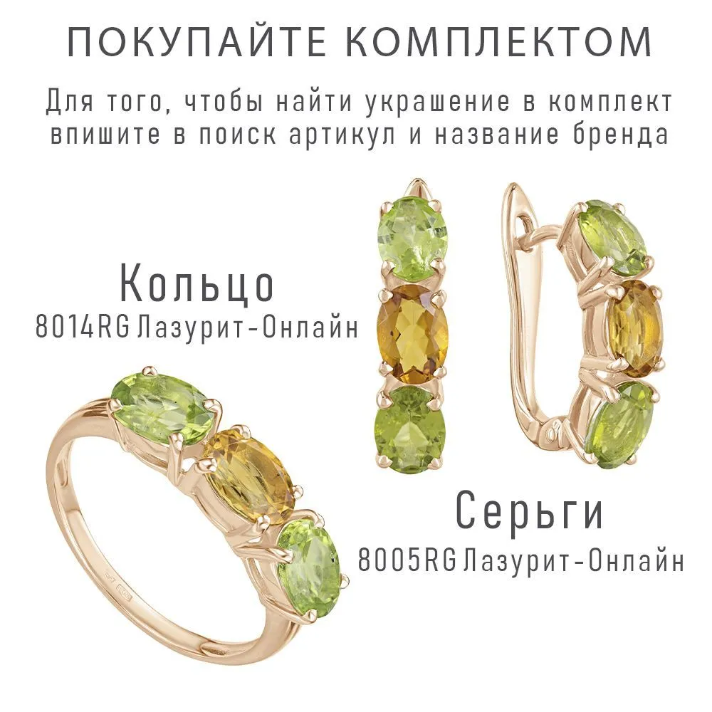 Серебряное кольцо с натуральными камнями цитрин и хризолит - коллекция Муза. Серебряное кольцо 925 пробы с покрытием красное золото. Цвет покрытия соответствует швейцарскому цветовому стандарту NIHS -5N и цвету красного золота 585 в России. На последней фотографии мы разместили сравнительную фотографию 3 цвета золотого покрытия. Помимо предания золотого цвета Вашему изделию, тонкий слой золота защищает от окисления. Для более стойкого эффекта золочения и долговечности покрытия мы дополнительно наносим подслой палладия (Pd). Средний вес изделия с камнями 2.48гр. Месторождение(я): Цитрин (Урал, Россия) и Хризолит (Якутия, Россия). Цитрин (Натуральный) овал 5*7 мм., средний вес: 0.90 карат. Хризолит (Натуральный) овал 5*7 мм., средний вес: 0.85 карат. Все изделия собственного производства, гарантия 12 месяцев. Арт. 8014