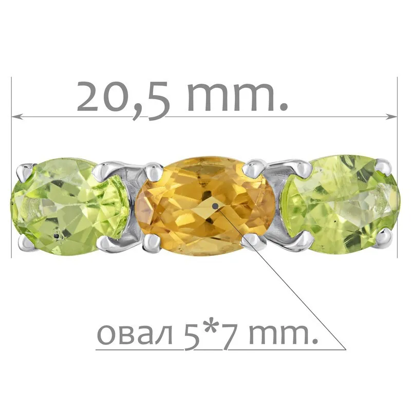 Серебряное кольцо с натуральными камнями цитрин и хризолит - коллекция Муза / покрытие Белый Родий