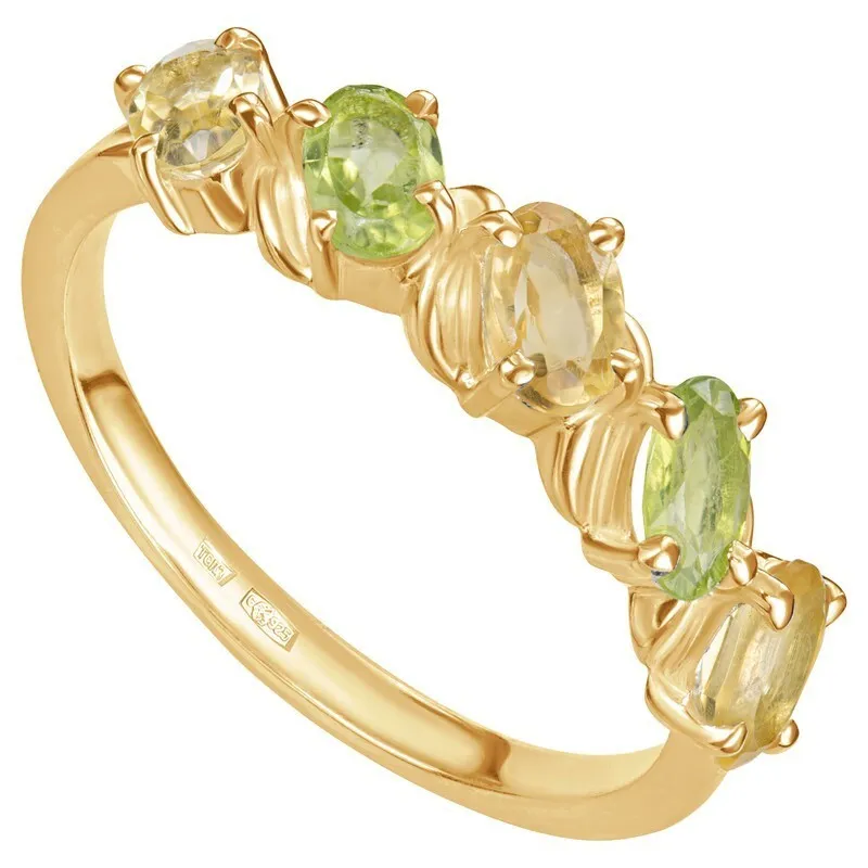 Серебряное кольцо с натуральными камнями цитрин и хризолит - коллекция Колосок. Серебряное кольцо 925 пробы с покрытием желтое золото. Цвет покрытия соответствует швейцарскому цветовому стандарту NIHS -FF24ct и цвету чистого золото 999.99. На последней фотографии мы разместили сравнительную фотографию 3 цвета золотого покрытия. Помимо предания золотого цвета Вашему изделию, тонкий слой золота защищает от окисления. Для более стойкого эффекта золочения и долговечности покрытия мы дополнительно наносим подслой палладия (Pd). Средний вес изделия с камнями 2.18 гр. Месторождения: Цитрин (Урал, Россия) и Хризолит (Якутия, Россия) Цитрин (Натуральный) овал 3*5 мм., средний вес: 0.24 карат. Хризолит (Натуральный) овал 3*5 мм., средний вес: 0.25 карат. Все изделия собственного производства, гарантия 12 месяцев. Арт. 8045