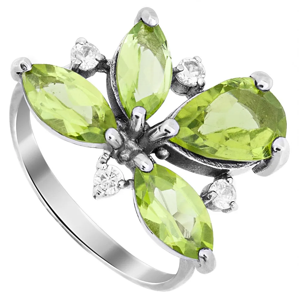 Серебряное кольцо "Аврора" с натуральным хризолитом, покрытие Черный Родий. Средний вес украшения с камнями 3,48 гр. Месторождение(я) камней: Хризолит (Якутия, Россия) . Хризолит (Натуральный) маркиз: 4*8 мм., средний вес 0,60 карат. Хризолит (Натуральный) груша: 6*9 мм., средний вес 1,00 карат.