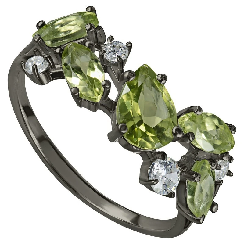 Серебряное кольцо с натуральным хризолитом - коллекция Росинка, покрытие Черный Родий.