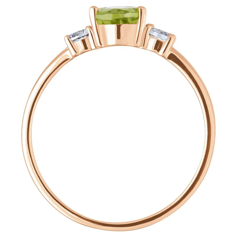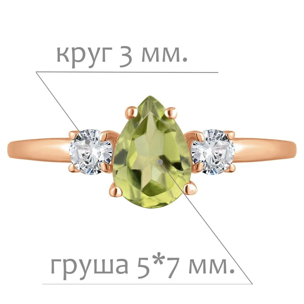 Серебряное кольцо с натуральным хризолитом - коллекция Алсу (малая) / Красное Золото. Средний вес украшения с камнями 1.35 гр. Месторождение: Хризолит (Якутия, Россия). Ювелирные вставки: Хризолит (Натуральный) груша 5*7 мм., средний вес: 0.73 карат. Белый Нанокристалл круг 3 мм. Все изделия собственного производства и имеют гарантию 12 месяцев, к каждому изделию прилагается паспорт. Арт. 8816RG