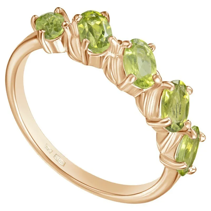 Серебряное кольцо с натуральным хризолитом - коллекция Колосок. Серебряное кольцо 925 пробы с покрытием розовое золото. Цвет покрытия соответствует швейцарскому цветовому стандарту NIHS -4N и цвету розового золота 585 в России. На последней фотографии мы разместили сравнительную фотографию 3 цвета золотого покрытия. Помимо предания золотого цвета Вашему изделию, тонкий слой золота защищает от окисления. Для более стойкого эффекта золочения и долговечности покрытия мы дополнительно наносим подслой палладия (Pd). Средний вес изделия с камнями 2.29 гр. Месторождение: Хризолит (Якутия, Россия) . Хризолит (Натуральный) овал 3*5 мм., средний вес: 0.22 карат. Все изделия собственного производства, гарантия 12 месяцев. Арт. 7988