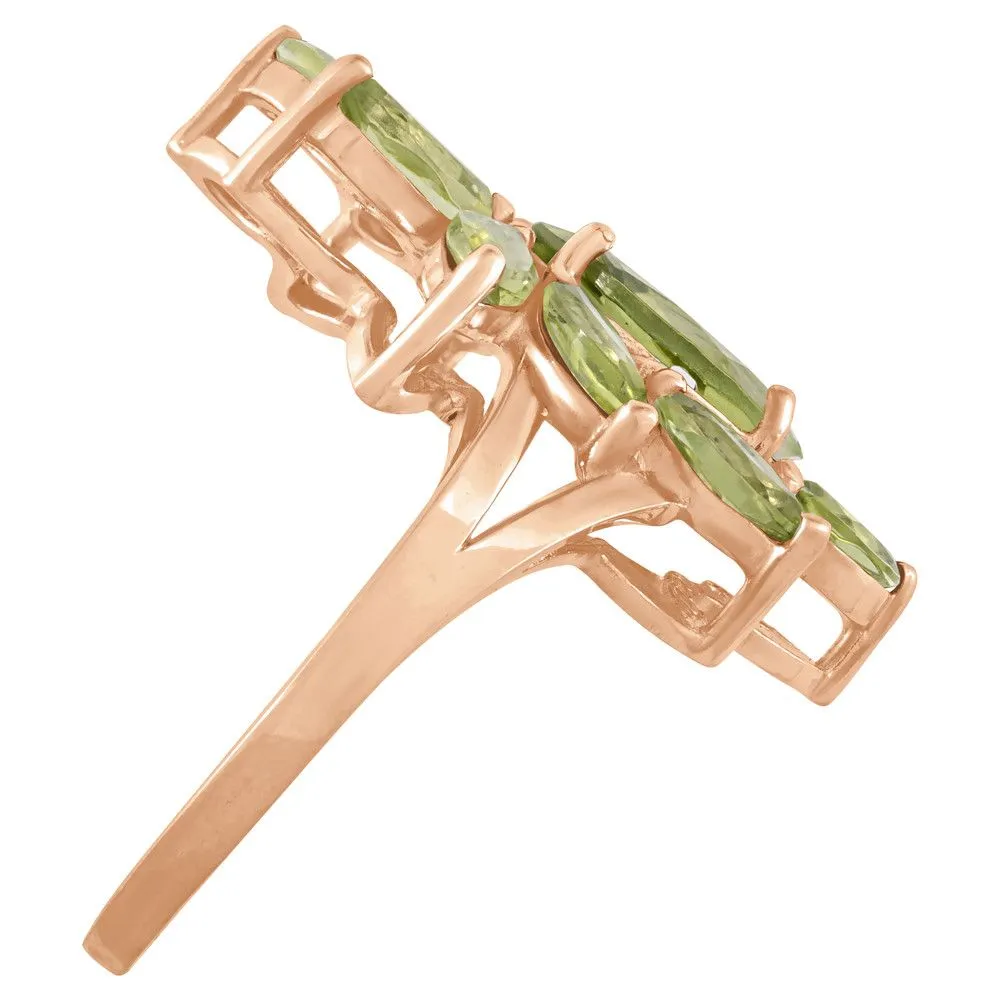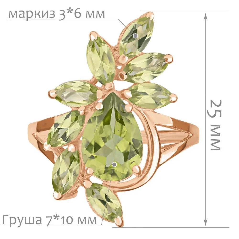 Серебряное кольцо с натуральным хризолитом - коллекция Элегия / покрытие Красное золото. Средний вес украшения с камнями 3.94 гр. Месторождение: Хризолит (Якутия, Россия) Ювелирные вставки: Хризолит (Натуральный) груша 7*10 мм., средний вес: 1.89 карат. Хризолит (Натуральный) маркиз 3*6 мм., средний вес: 0.25 карат. Все изделия собственного производства и имеют гарантию 12 месяцев. Арт. 8780RG. Хризолит – камень, который называют «вечерним изумрудом» за удивительную способность менять цвет в зависимости от освещения. Считается, что хризолит очень любила Клеопатра. Хризолитовый порошок используется для общего восстановления организма, для очищения пищи от ядов и токсинов и улучшения работы ЖКТ. Кроме того, минерал защищает от опасностей и укрепляет дружеские отношения.