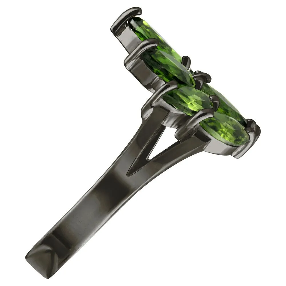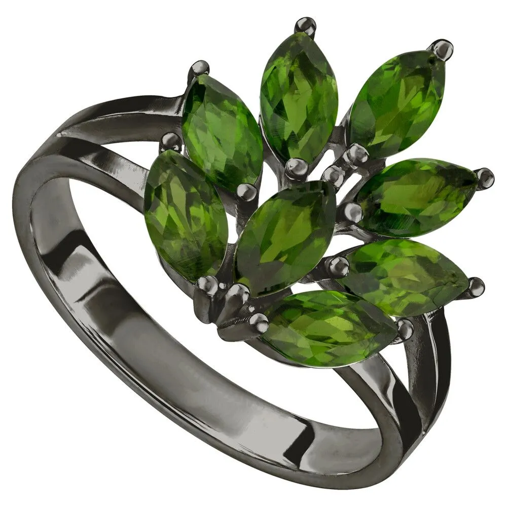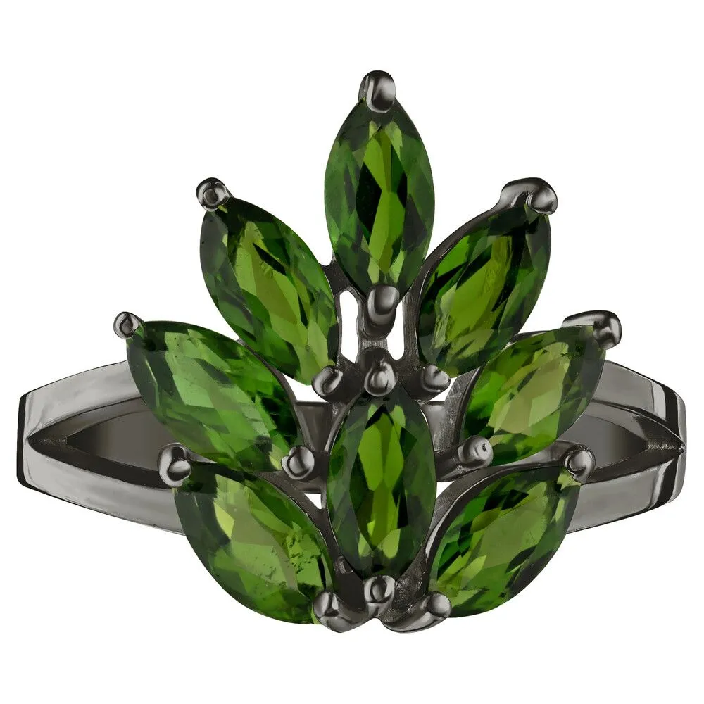 Серебряное кольцо с натуральным хромдиопсидом - коллекция Искра / Черный Родий. Средний вес украшения с камнями 3.06 гр. Месторождение: Хромдиопсид (Якутия, Россия). Ювелирные вставки: Хромдиопсид (Натуральный) маркиз 3*6 мм., средний вес: 0.27 карат. Все изделия собственного производства и имеют гарантию 12 месяцев, к каждому изделию прилагается паспорт. Арт. 8905BR