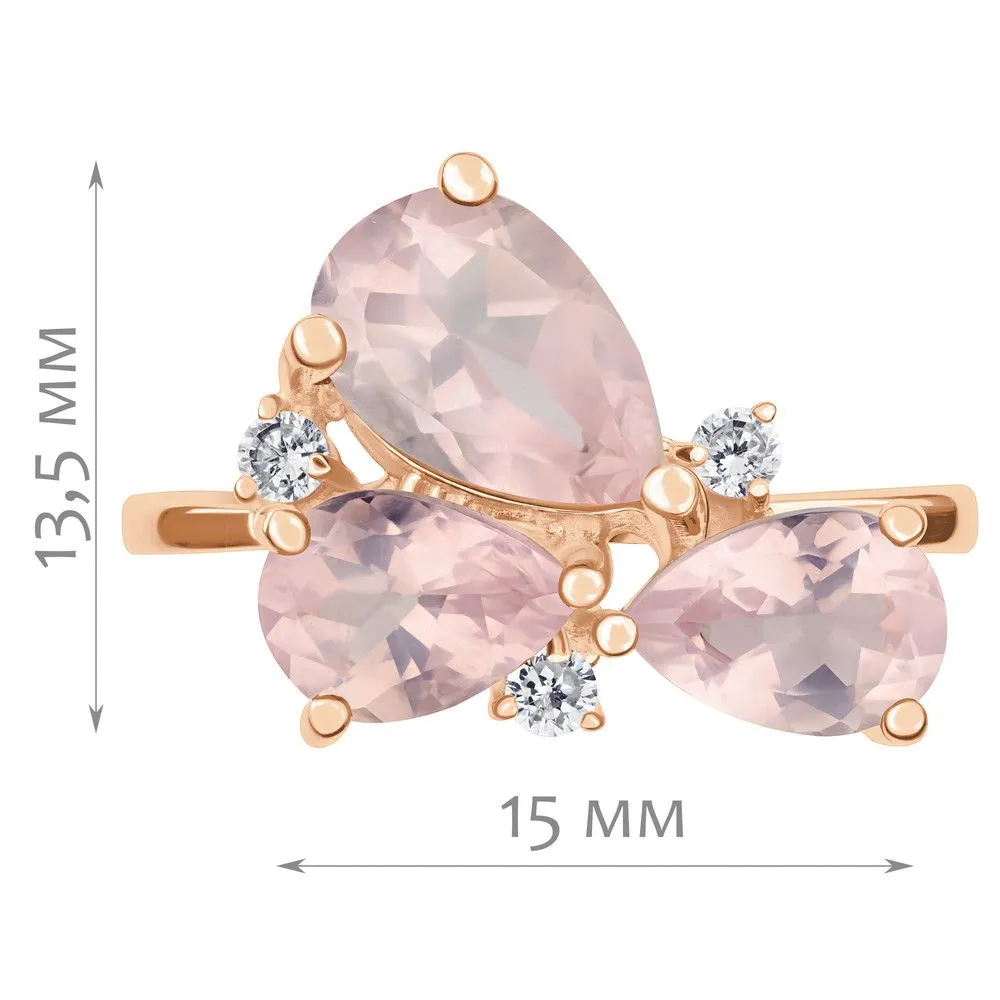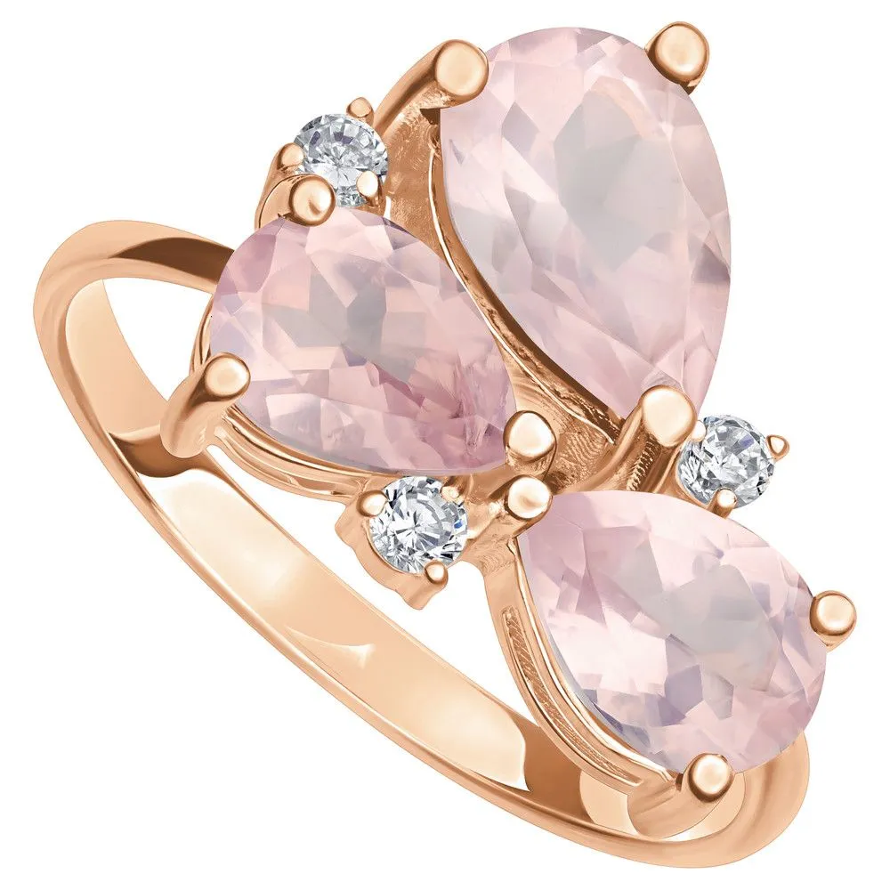 Серебряное кольцо с натуральным розовым кварцем - коллекция Капель / покрытие Красное золото. Средний вес украшения с камнями 3.08 гр. Месторождение: Розовый кварц (Приполярный Урал, Россия) Ювелирные вставки: Розовый кварц (Натуральный) груша 6*9 мм., средний вес: 1.16 карат. Розовый кварц (Натуральный) груша 5*7 мм., средний вес: 0.76 карат. Все изделия собственного производства и имеют гарантию 12 месяцев. Арт. 8769RG. Розовый кварц – камень сердца. Такое название он получил за способность приносить умиротворение и любовь. Он дарит сочувствие и глубокое понимание гармонии мира. Не обделён он и лечебными свойствами. Это талисман для привлечения в жизнь глубоких чувств и обретения семейного счастья.