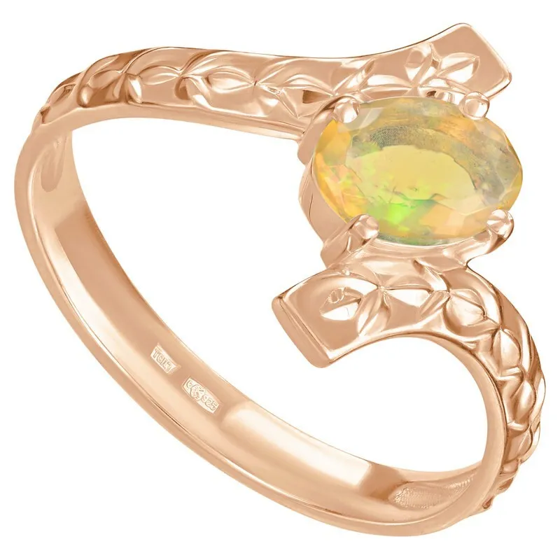 Серебряное кольцо с натуральным опалом (2 класс) - коллекция Тея. Серебряное кольцо 925 пробы с покрытием красное золото. Цвет покрытия соответствует швейцарскому цветовому стандарту NIHS -5N и цвету красного золота 585 в России. На последней фотографии мы разместили сравнительную фотографию 3 цвета золотого покрытия. Помимо предания золотого цвета Вашему изделию, тонкий слой золота защищает от окисления. Для более стойкого эффекта золочения и долговечности покрытия мы дополнительно наносим подслой палладия (Pd). Средний вес изделия с камнями 2.47 гр. Месторождение: Опал (Эфиопия) Опал (Натуральный) овал 5*7 мм., средний вес: 0.46 карат. Все изделия собственного производства, гарантия 12 месяцев. Арт. 8065