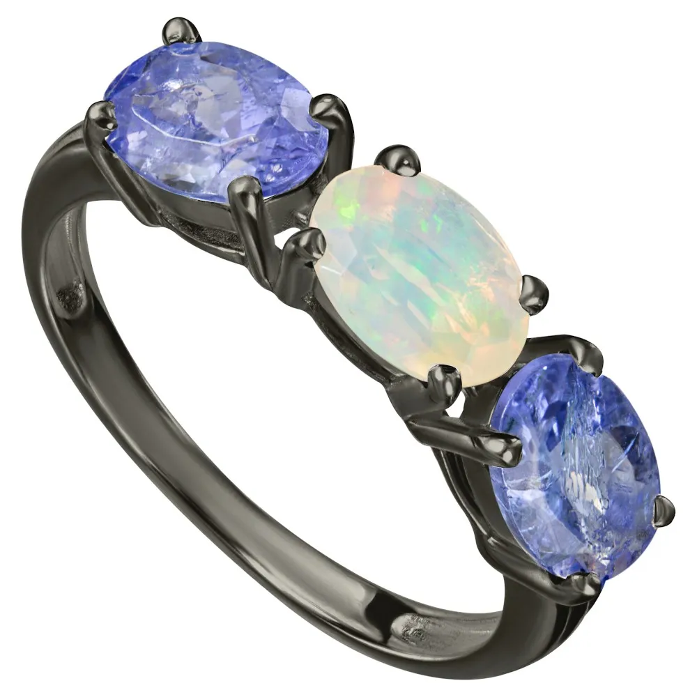 Серебряное кольцо с натуральными камнями танзанит и опал - коллекция Муза, покрытие Черный Родий.