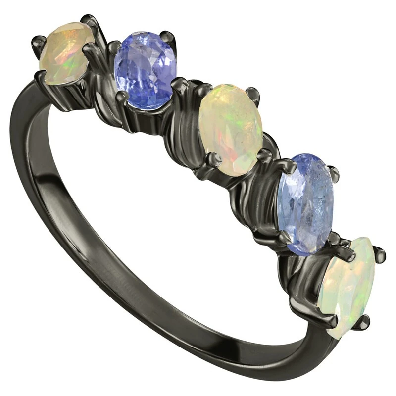 Серебряное кольцо с натуральными камнями танзанит и опал - коллекция Колосок, покрытие Черный Родий.