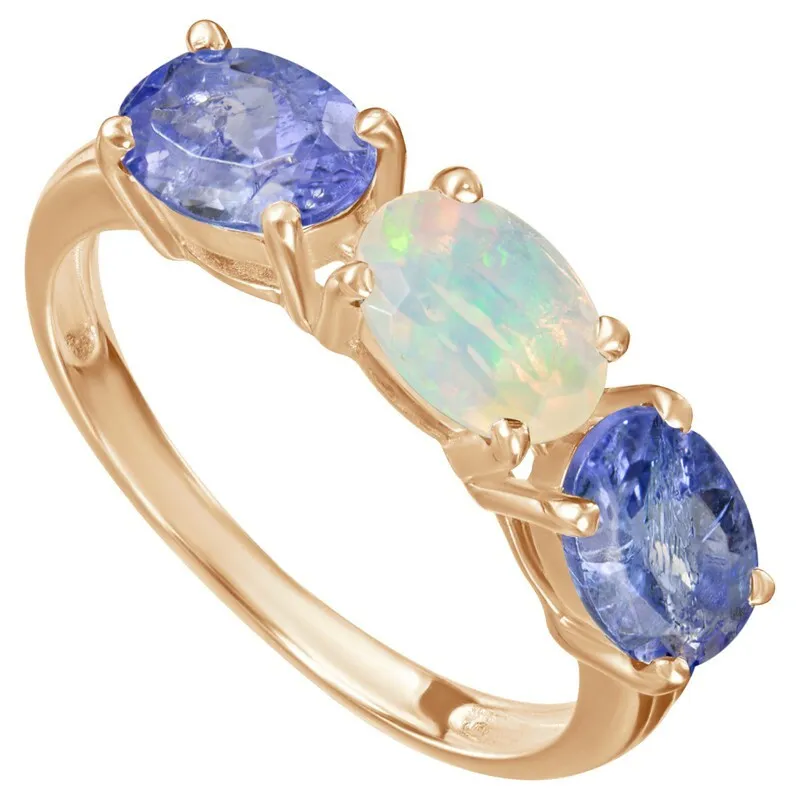 Серебряное кольцо с натуральными камнями танзанит и опал - коллекция Муза. Серебряное кольцо 925 пробы с покрытием розовое золото. Цвет покрытия соответствует швейцарскому цветовому стандарту NIHS -4N и цвету розового золота 585 в России. На последней фотографии мы разместили сравнительную фотографию 3 цвета золотого покрытия. Помимо предания золотого цвета Вашему изделию, тонкий слой золота защищает от окисления. Для более стойкого эффекта золочения и долговечности покрытия мы дополнительно наносим подслой палладия (Pd). Средний вес изделия с камнями 2.79 гр. Месторождения: Танзанит (провинция Аруша, Танзания) и Опал (Эфиопия). Танзанит (Натуральный) овал 5*7 мм., средний вес: 0.89 карат. и Опал (Натуральный) овал 5*7 мм., средний вес: 0.46 карат. Все изделия собственного производства, гарантия 12 месяцев. Арт. 8091