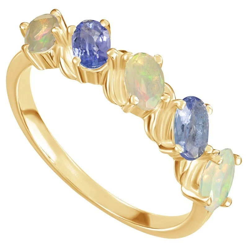 Серебряное кольцо с натуральными камнями танзанит и опал - коллекция Колосок. Серебряное кольцо 925 пробы с покрытием желтое золото. Цвет покрытия соответствует швейцарскому цветовому стандарту NIHS -FF24ct и цвету чистого золото 999.99. На последней фотографии мы разместили сравнительную фотографию 3 цвета золотого покрытия. Помимо предания золотого цвета Вашему изделию, тонкий слой золота защищает от окисления. Для более стойкого эффекта золочения и долговечности покрытия мы дополнительно наносим подслой палладия (Pd). Средний вес изделия с камнями 2.39 гр. Месторождения: Танзанит (провинция Аруша, Танзания) и Опал (Эфиопия). Танзанит Опал (Натуральный) овал 3*5 мм., средний вес: 0.24 карат. и Опал (Натуральный) овал 3*5 мм., средний вес: 0.15 карат. Все изделия собственного производства, гарантия 12 месяцев. Арт. 8097